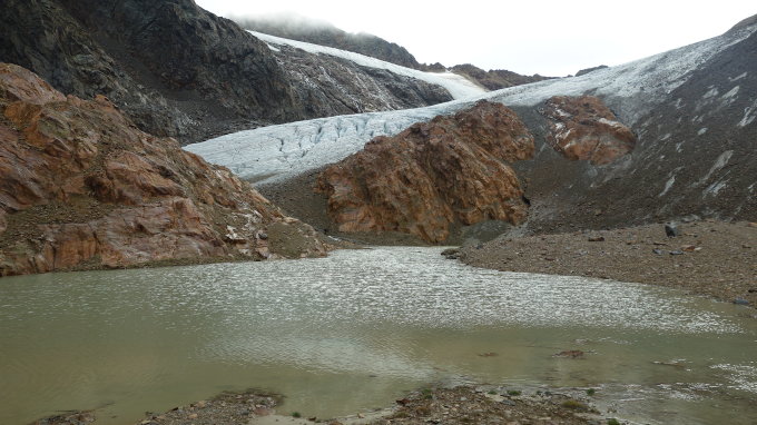 Start 6:30 bei leichtem Regen. Durchgehend markiert bis Gletscher (Steinmänner, Stangen). Gletscher größtenteils aper bis ca 3250. Es hat einige kleine und grosse Spalten, die aber gut zu umgehen sind. Vor Erreichen des kleinen Gletscherrückens der zu Hintereisjoch und Matscher Wandl führt ist eine grosse Spalte die mit Vorsicht zu geniessen ist, da die Schneebedeckung ziemlich instabil ist.