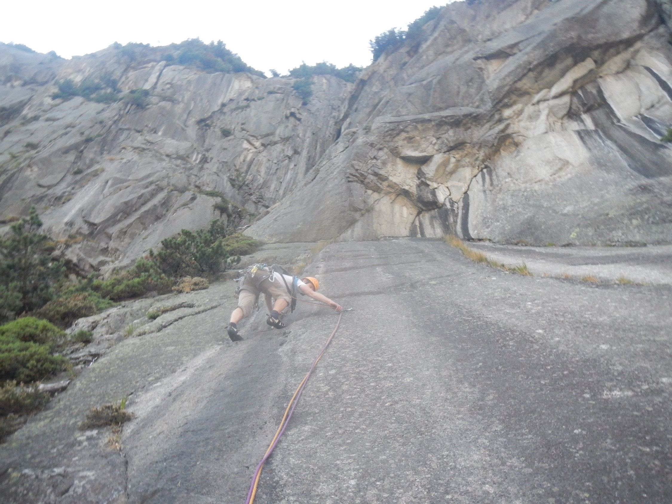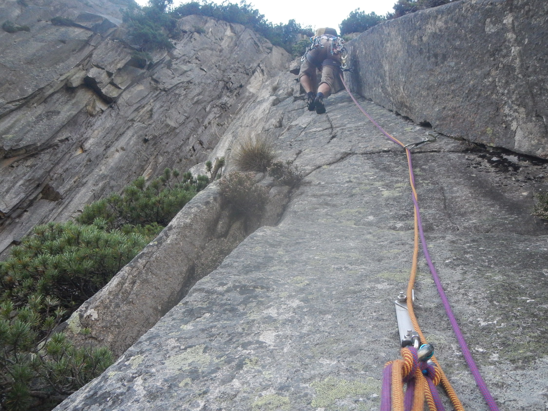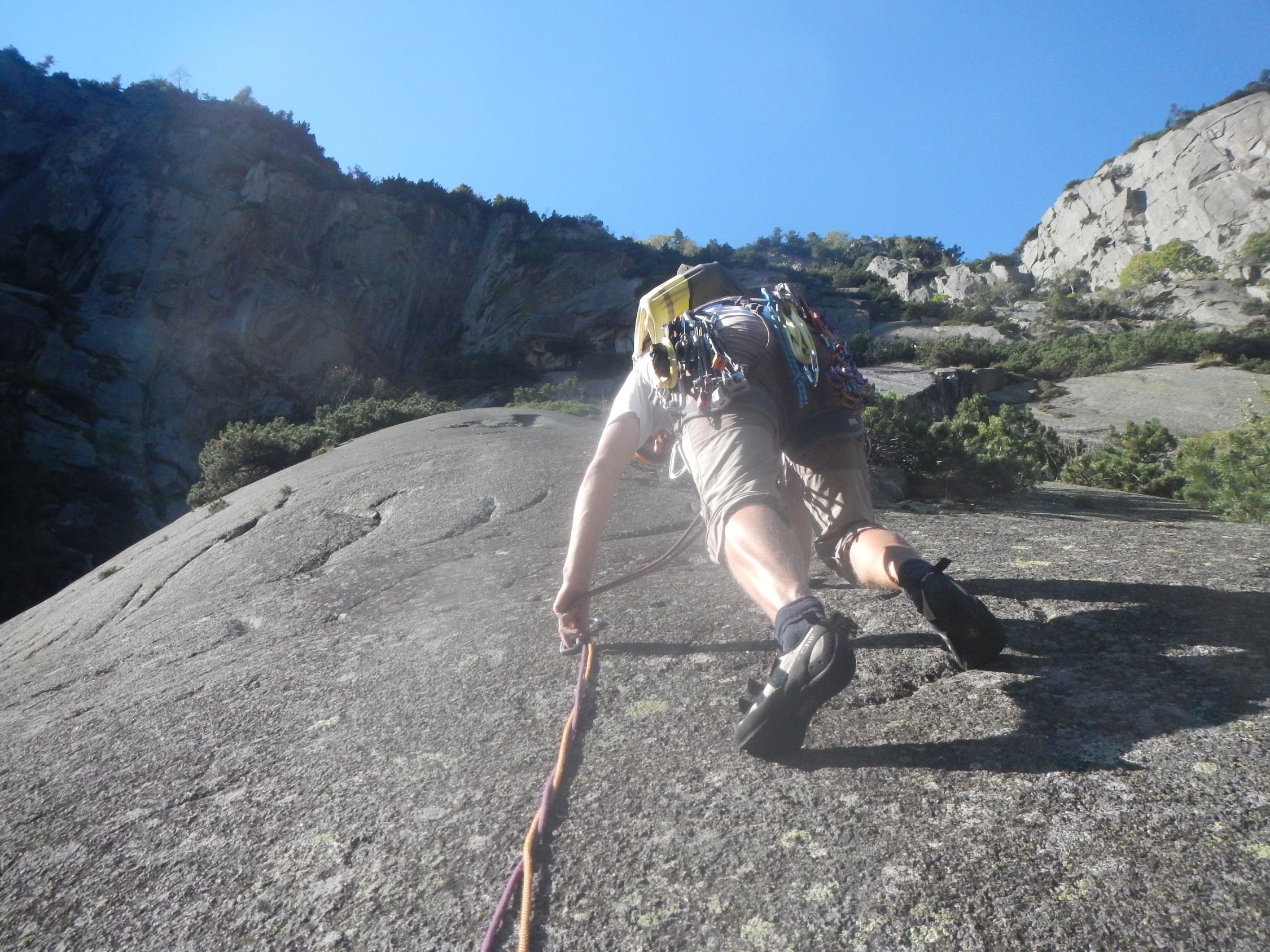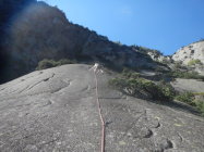 Alles trocken, teils etwas Laub und anderes Material auf den Tritten wegen einsetzendem Herbst. Am besten haben uns die zwei letzten, steilen SL gefallen. Die Reibungsplatten sind z.T. sehr glatt und diffizil, die schwierigen Passagen können aber auch entlang der seitlichen Latschenkiefern "umgangen" werden.