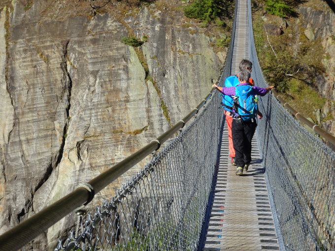 Unbedingt beachten: bei der Traverse der Hängebrücke die schönen Farben des wunderbaren Gletscherschliffs. Wunderschön und interessant.