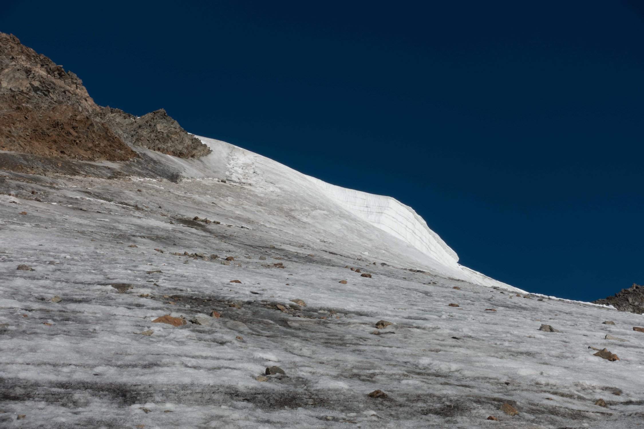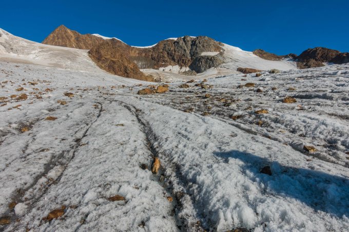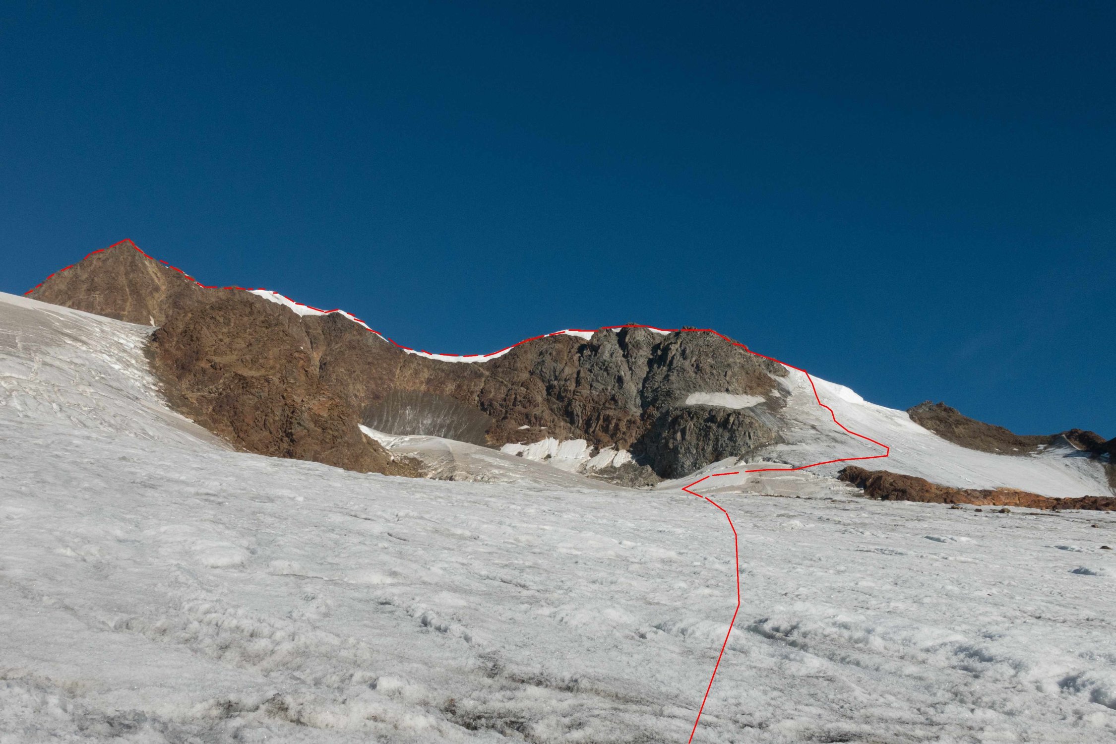 Spalten offen und gut sichtbar. Wechsel auf Steigeisen auf ca. 3260m.