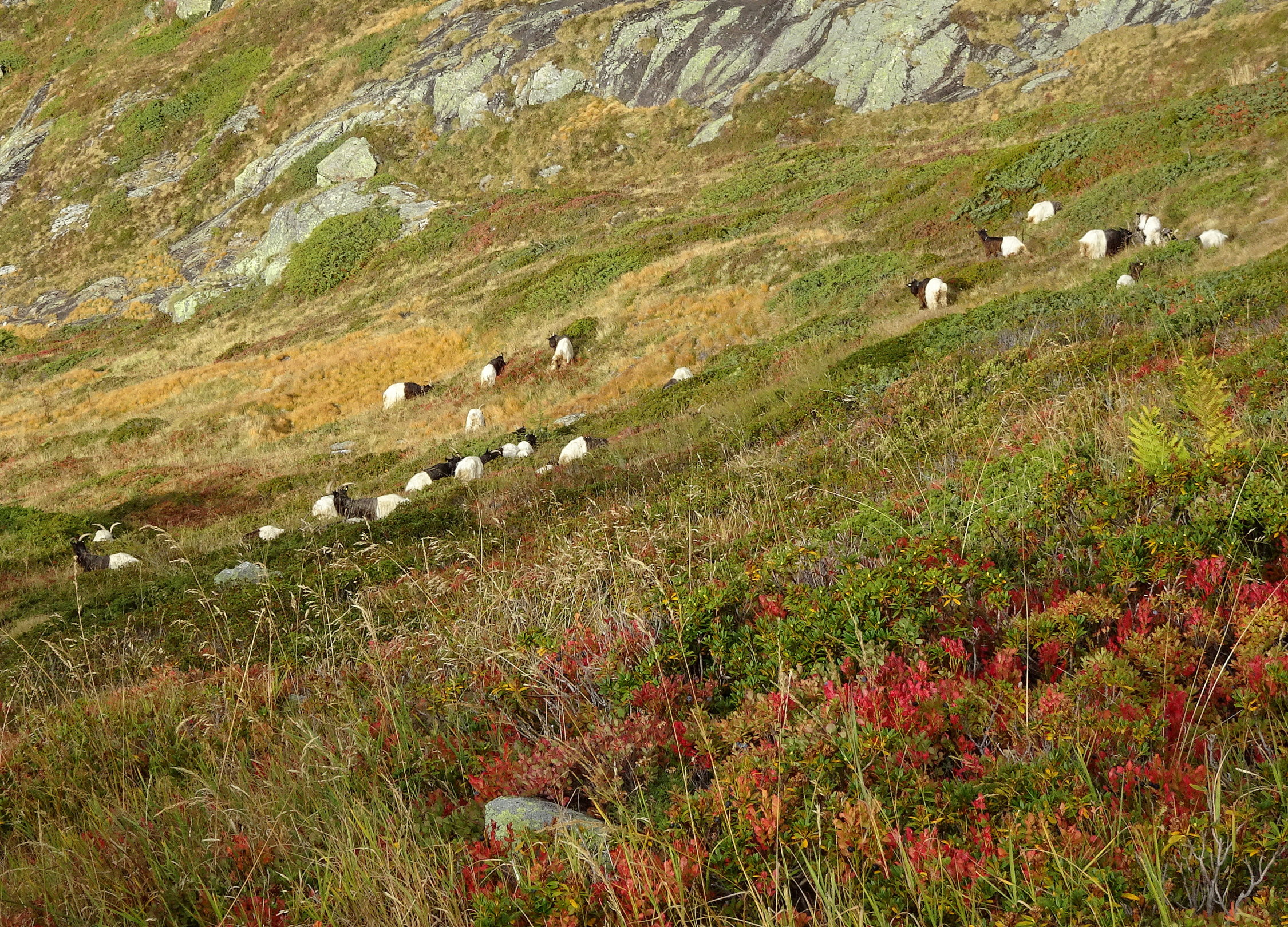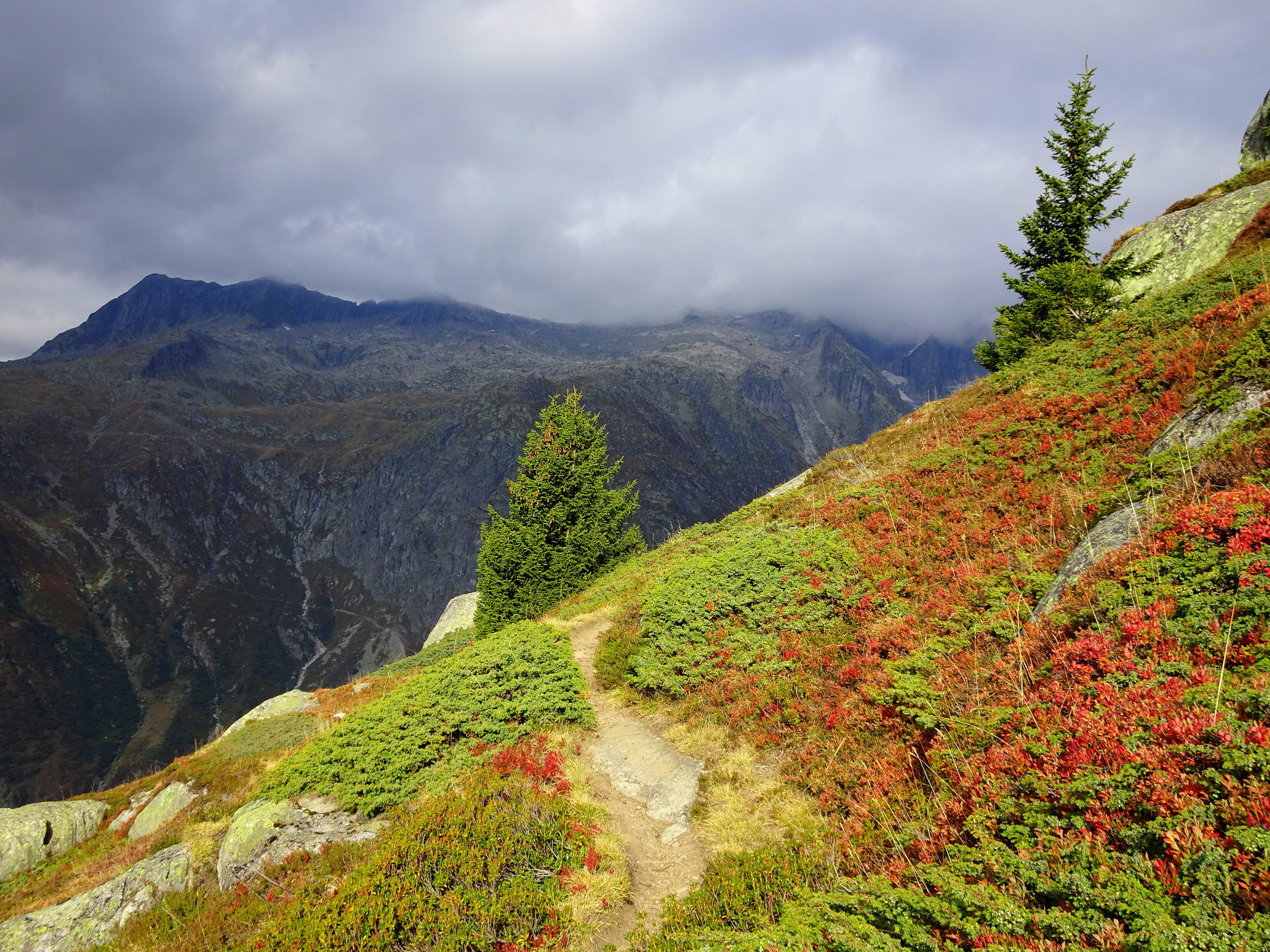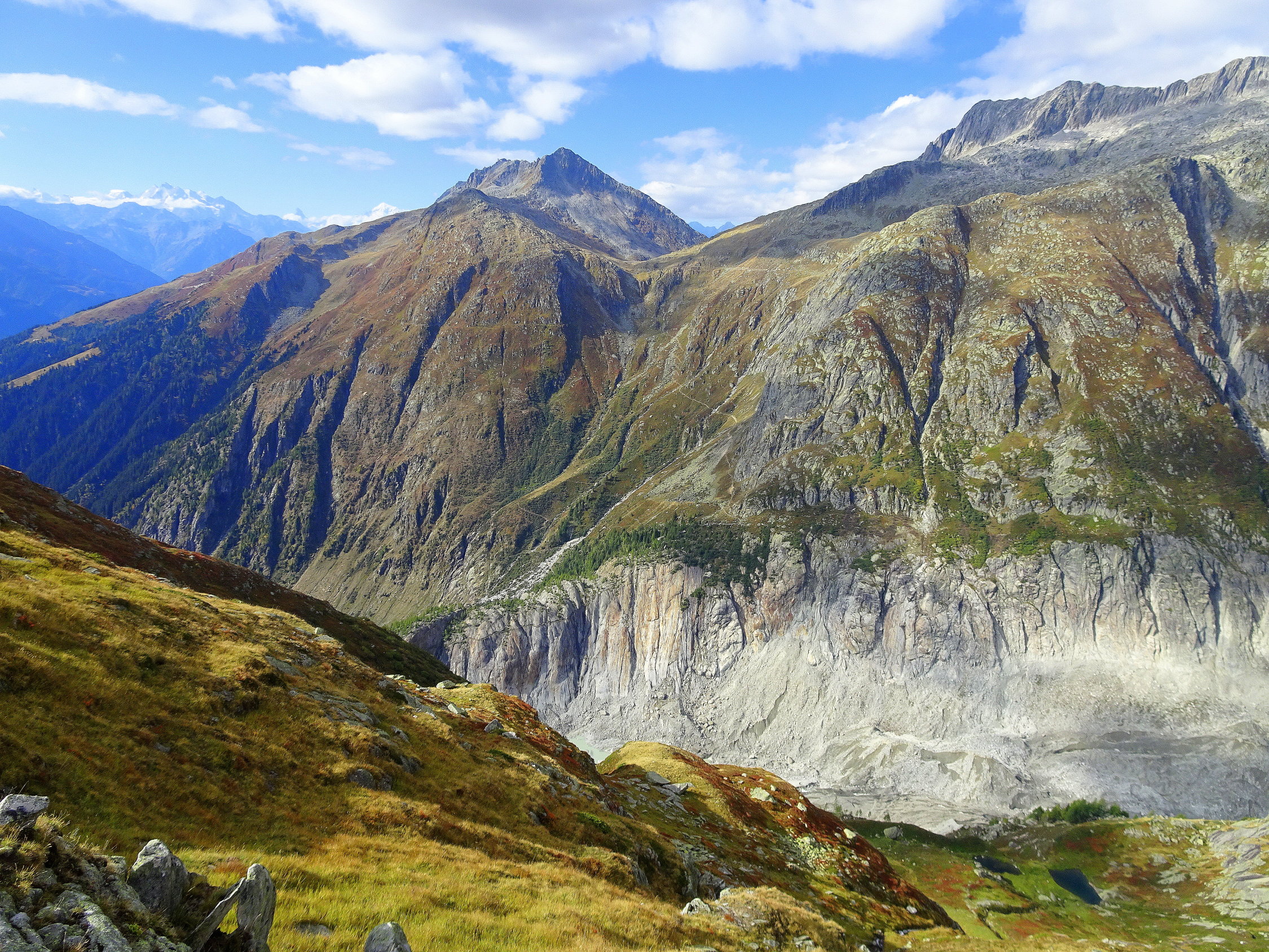 Vor vier Tagen schauten wir vom Aussichtspunkt Stock zur grossen, ehemaligen Weide vis-à-vis und rätselten ob sie noch erreichbar wäre. So habe ich gedacht, ich gehe mal schauen. Sie ist immer noch erreichbar. Am alten Unterbau des Weges, sieht man, dass es früher mit schwerem Gewicht belastet worden ist (Maulesel?). Interessant ist es, dass der Weg weiter bis zur Finsteraarhornhütte zieht, vom Punkt 2403 m. sind noch über 6 Std. angegeben. Ist dies die Reaktivierung eines alten Weges?