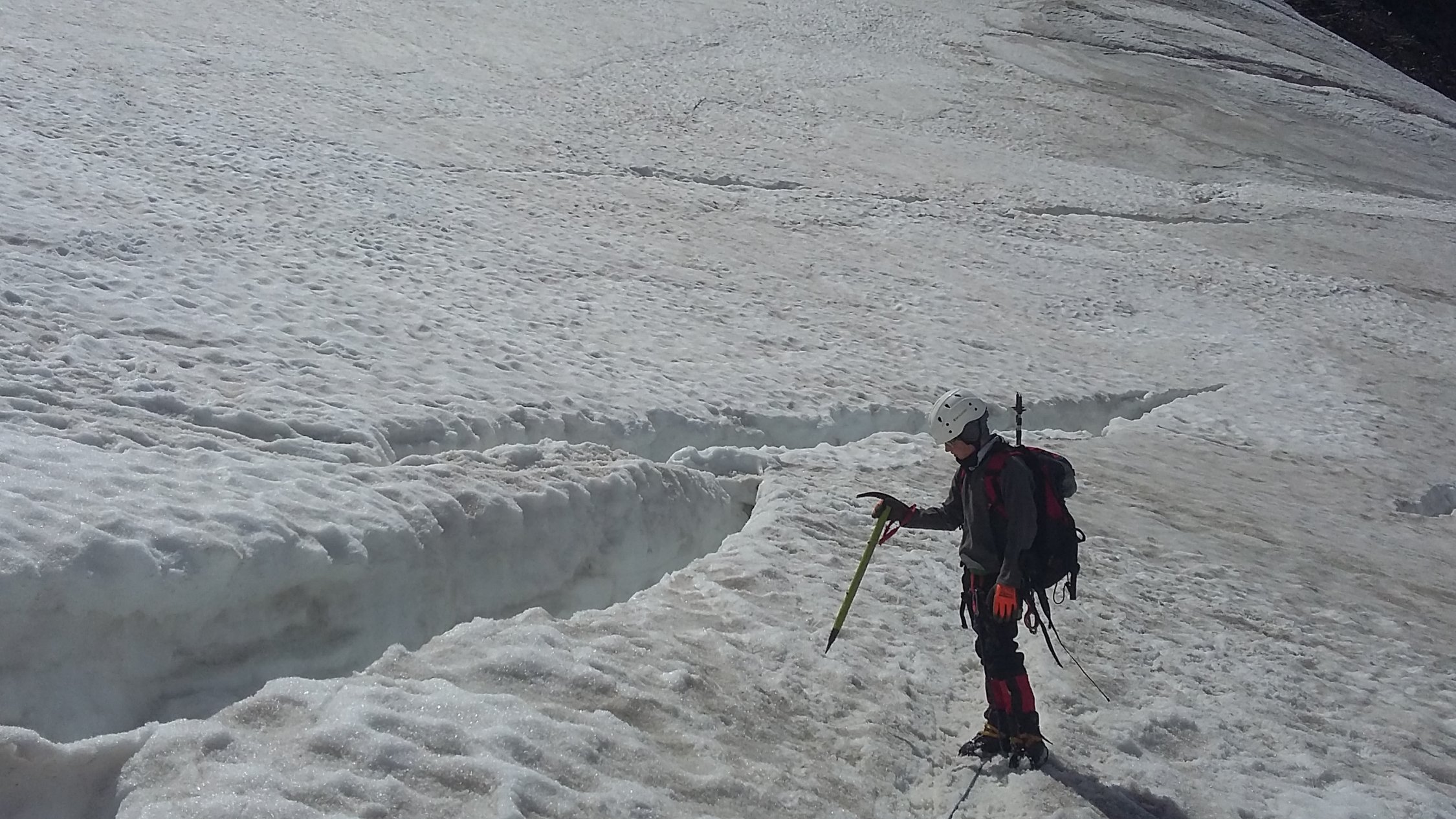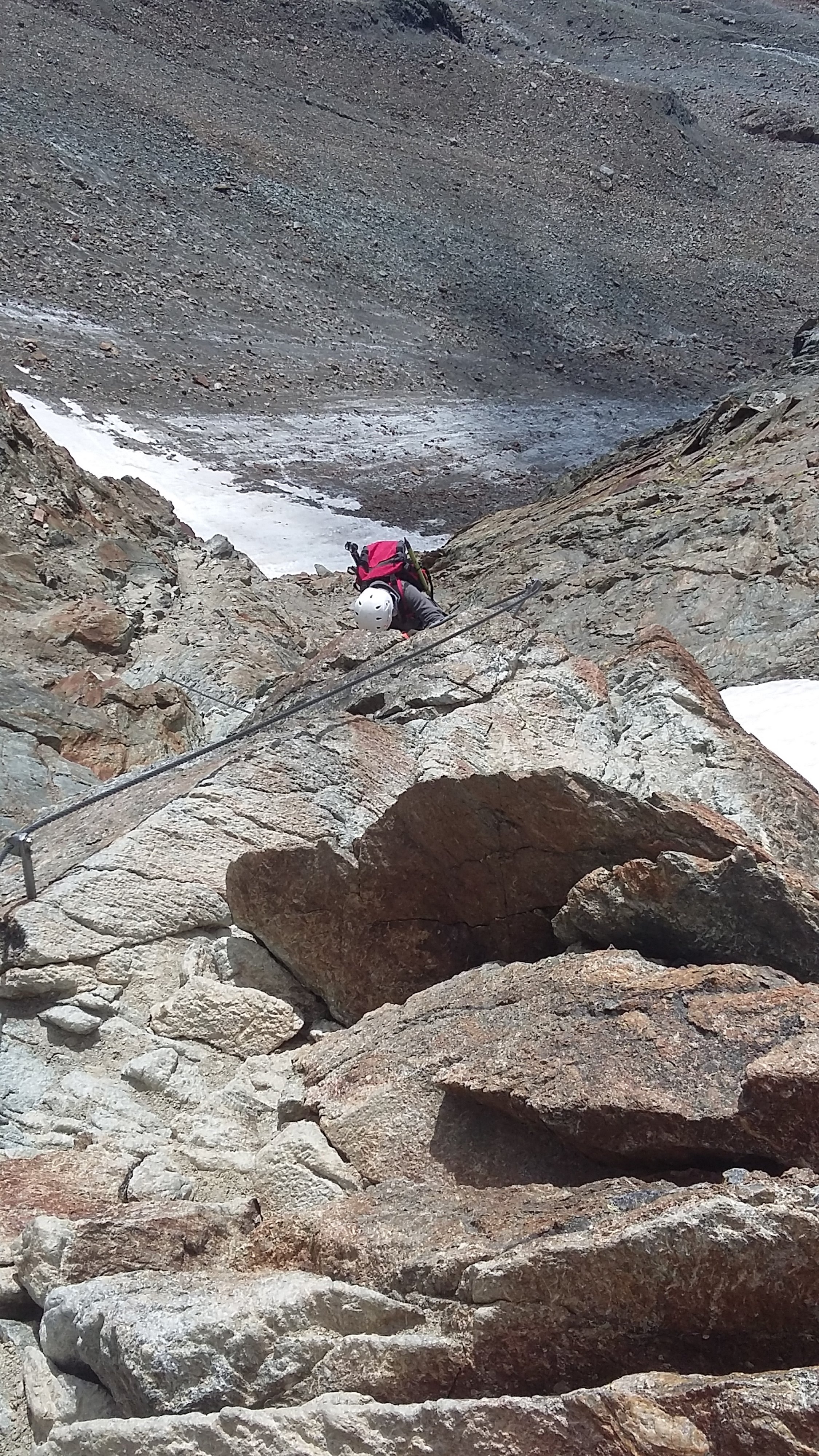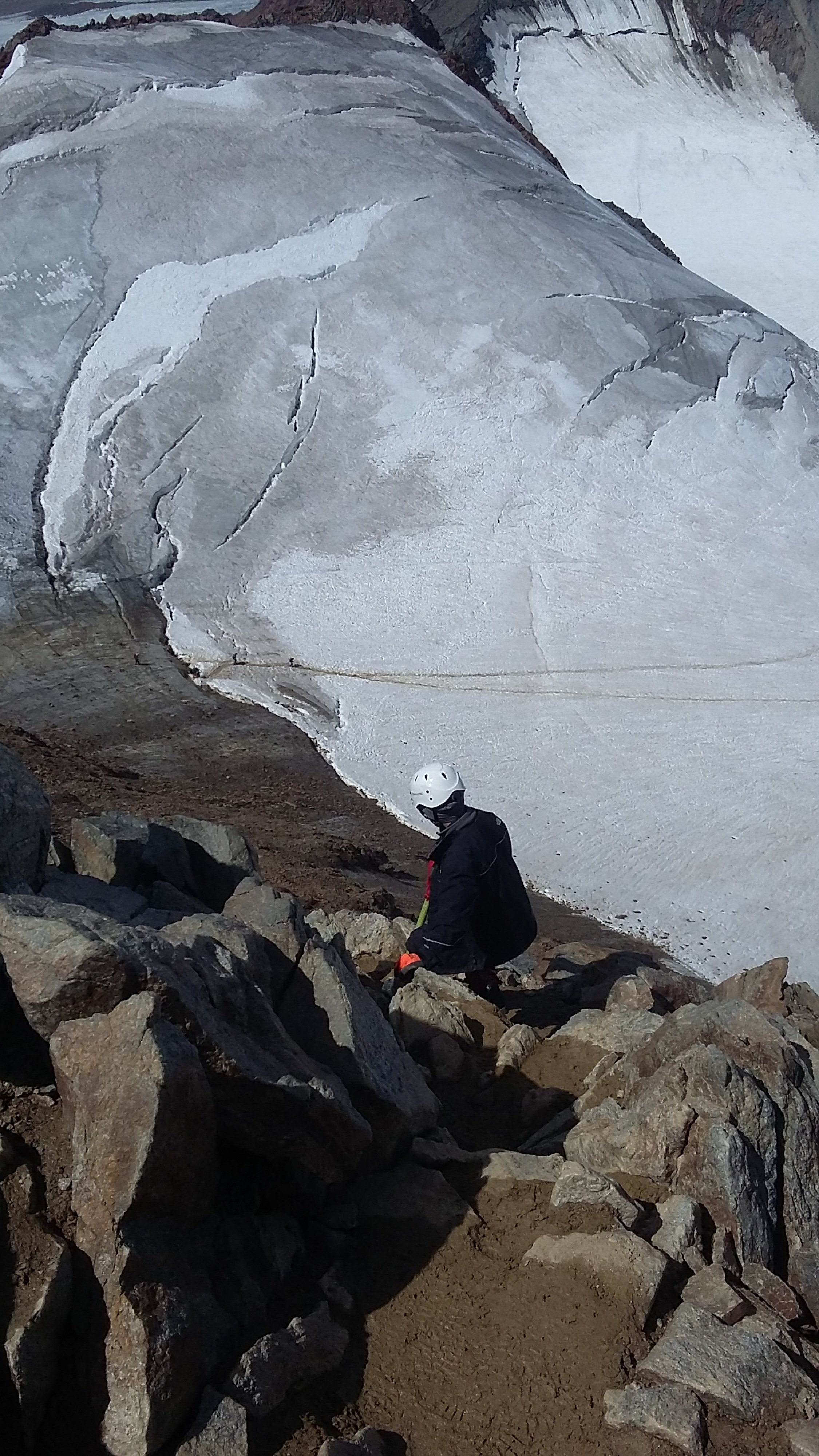 vom Mitterkarferner ist nicht mehr viel übrig - man hat die Wahl über Blankeis mit Geröll bedeckt in Fallinie aufzusteigen oder dem Verlauf der alten Spur über lockeres Geröll dem Talkessel auf der linken Seite zu folgen - beides eher unangenehm. Der Einstieg in den Klettersteig ist problemlos. Der obere Taschachgletscher hat nach wie vor gute Auflage. Der Steilaufschwung ist spaltenarm, doch die, die da sind müssen weiträumig umgangen werden. Gipfelgrat schneefrei und trocken.