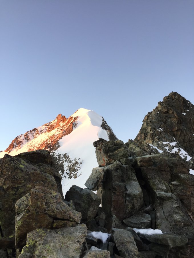 Alles seilfrei geklettert, außer 2x abseilen auf dem Spallagrat. Es können alle Türme und Zähne umgangen werden. Kein Blankeis auf dem Biancograt, welcher einer Treppe ähnelt.