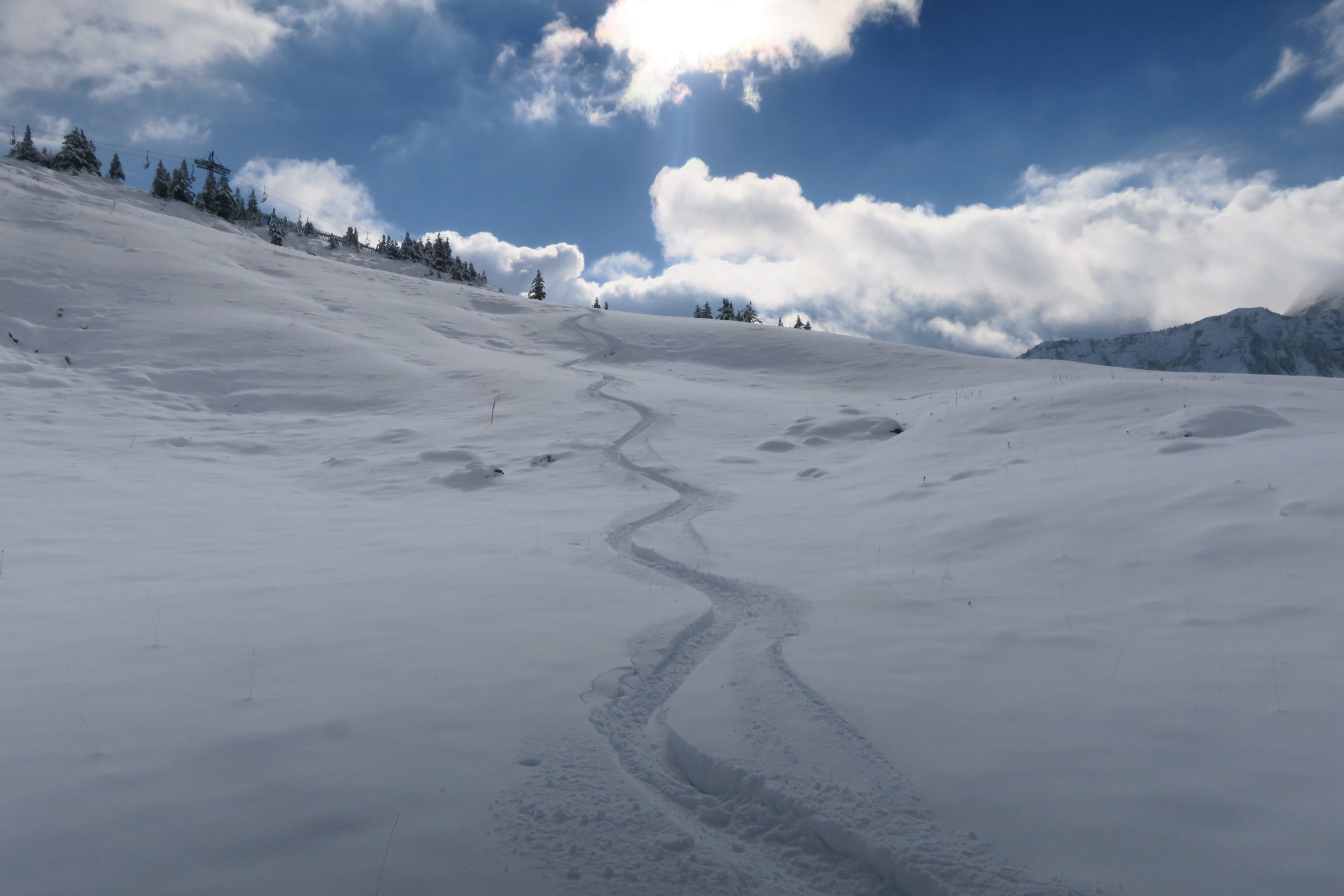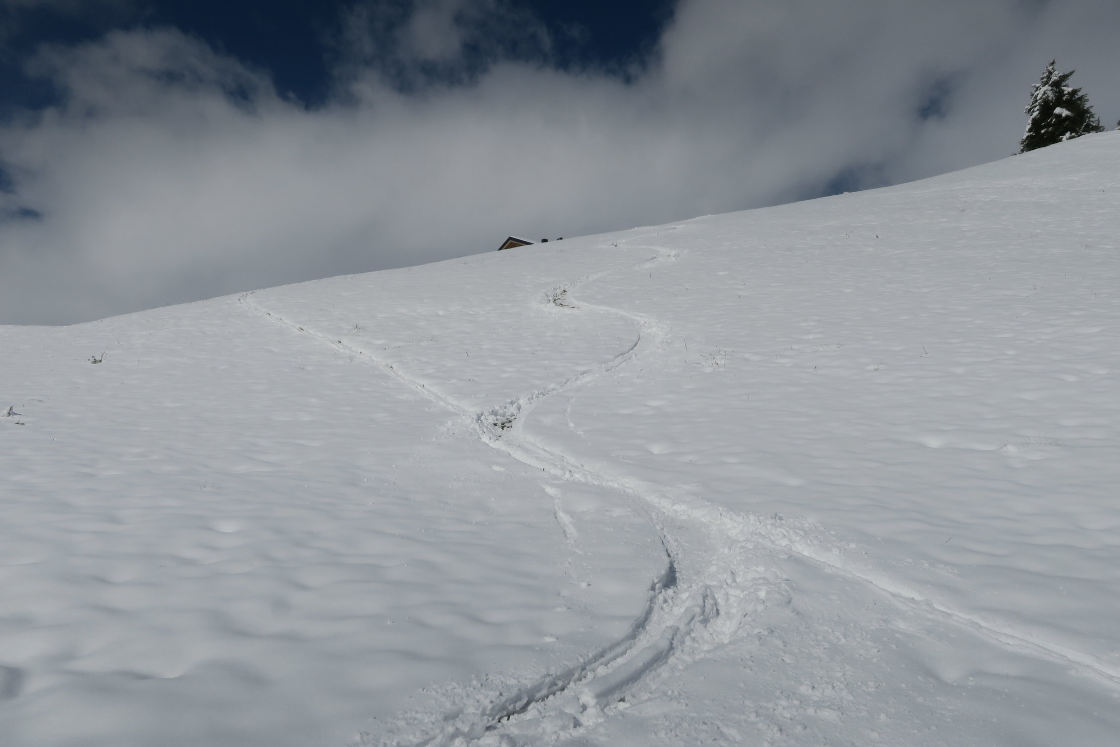 Weiter oben gut zu fahrender Neuschnee - unten dann schon ziemlich pappig und wenig Schnee