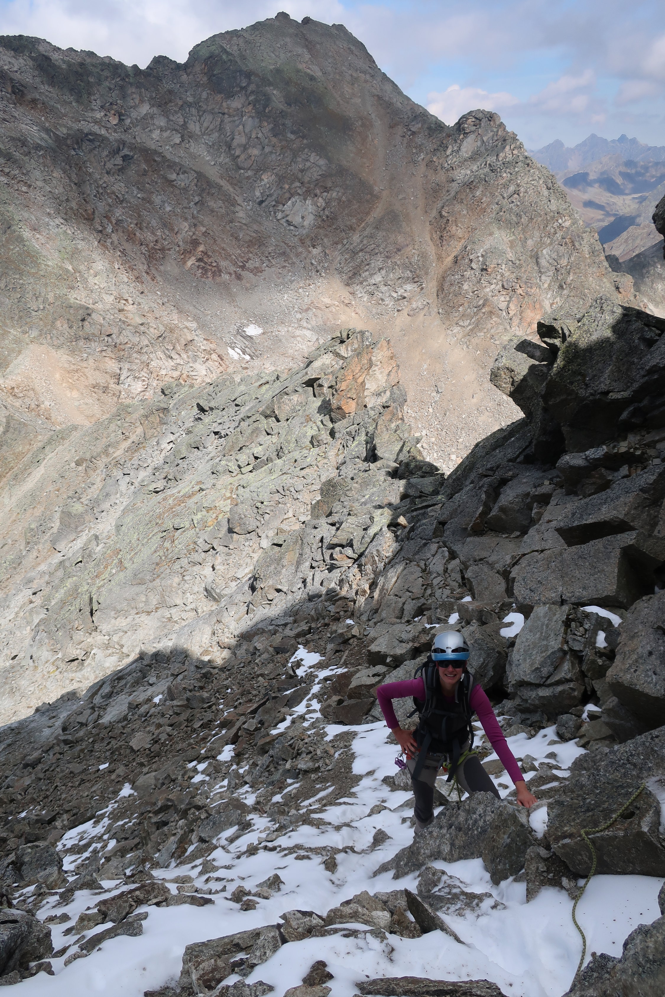 Der Zustieg zum Anfang des Grates kann eigentlich frei gewählt werden. Da gibt es nicht viel "Falsches". Ab P.2811 zwingt einem der Grat die Route auf, wenn man direkt gehen will. Sonst kann man noch recht viel rechts (südlich) des Grates umgehen. Wir haben uns bei P.2811 angeseilt, da wir fast alles am Grat direkt geklettert sind.