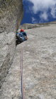 Nachdem sich am Einstieg der Motörhead schon drei Seilschaften stauten, haben wir kurzfristig umentschieden und sind in die Métal Hurlant eingestiegen. Nach drei SL stieg noch eine weitere Partie ein. èine schöne Tour mit filigraner Plattenschleicherei und einer traumhaften Kaminverscneidung in SL7, die mit drei BH abgesichert ist, Cams lassen sich sehr gut platzieren. Einen Dank an die Gebrüder Remy für die schöne Linie.