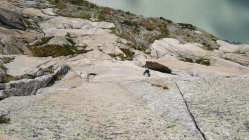 Eine Anmerkung zu den Bohrhaken: Es stecken noch ein paar von den alten, mittlerweile recht angegammelten BH. Mittlerweile wurde die Route saniert mit neuen Mammut INOX Plättchen und dabei auch einige Reibungsstellen entschärft. Gleichzeitig sind einige Rissstellen auch prima mit eigenen Mitteln abzusichern, wo jetzt Bohrhalken stecken. Jedoch wurden normale Stahlbohranker verwendet. Das führt aufgrund der Materialpaarung zwangsläufig zu weiterer Korrosion, was ein Ersetzen vermutlich bald wieder nötig macht. Desweiteren fehlt in der vierten Seillänge ein Plättchen bei einem Bohrhaken. Das empfand ich als nicht weiter schlimm, da der Riss dort prima mit Keilen und Cams abzusichern ist. Wers doch braucht, schiebt einfach das kabel eines kleinen Klemmkeils über das Gewinde des Bohrankers und blockiert es mit dem Keil ;-).