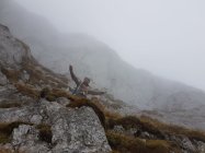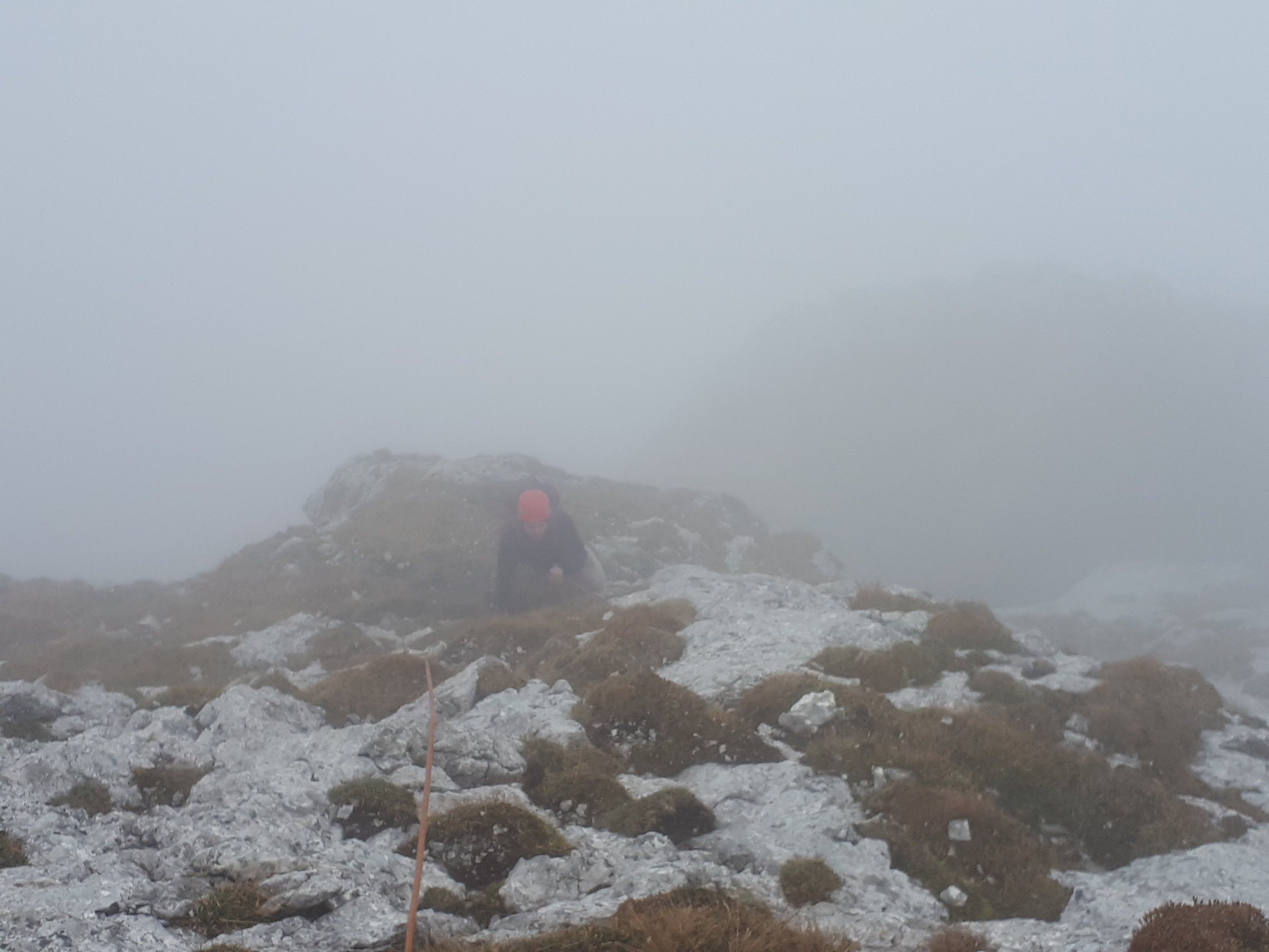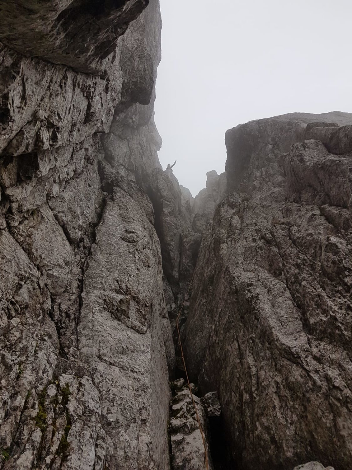 Ambiance face Nord, on était dans le nuage pendant toute la voie, mais rocher sec... itinaire assez évident à suivre, avec beaucoup de traces de crampons sur le rocher qui aide à s orienter. La deuxième longueur est bien protégée, sinon peu de spits mais escalade facile.. on reviendra pour la vue.. on fait ensuite qq voies du Klettergarten. Super rocher aussi !