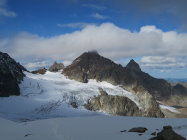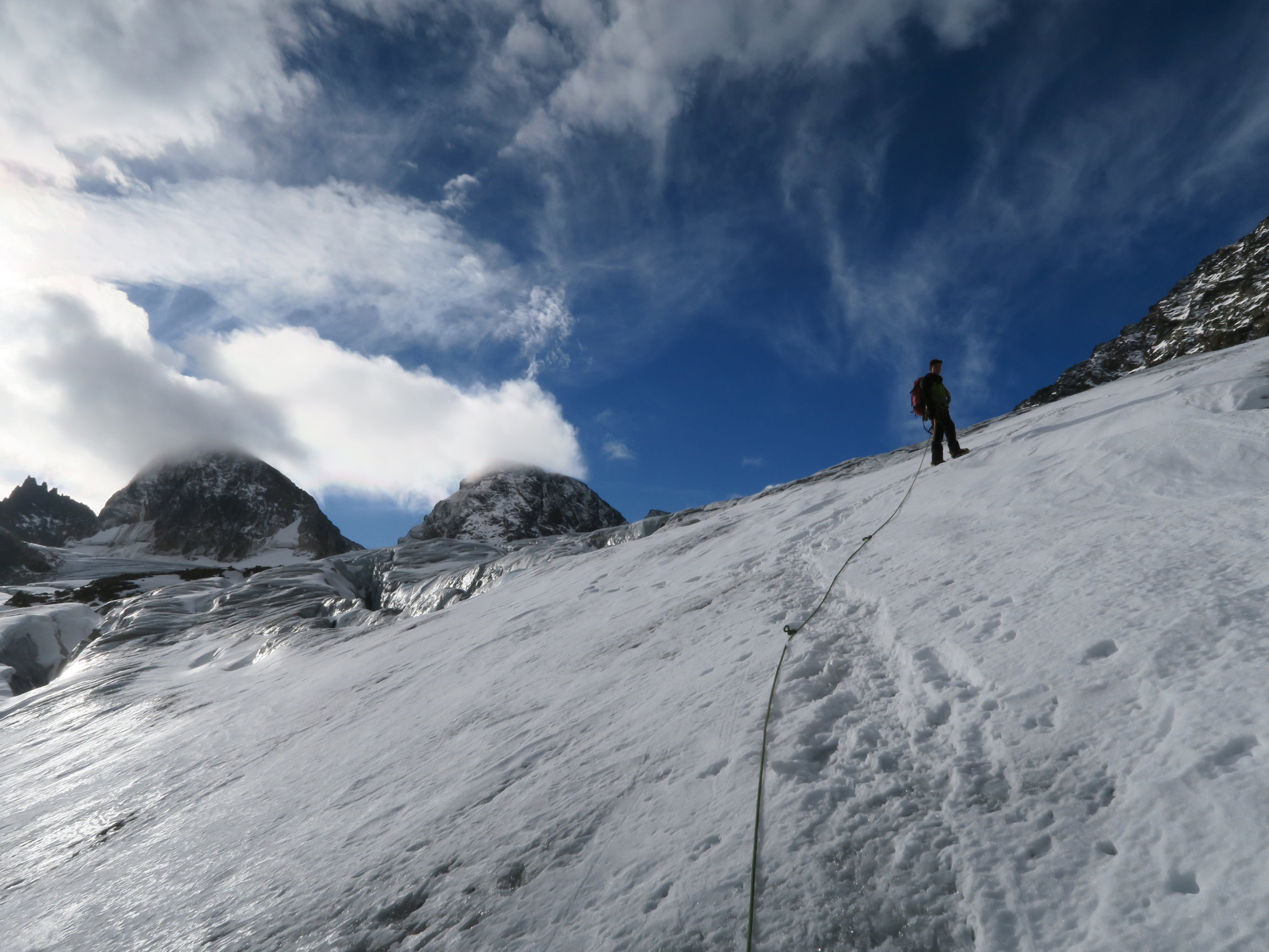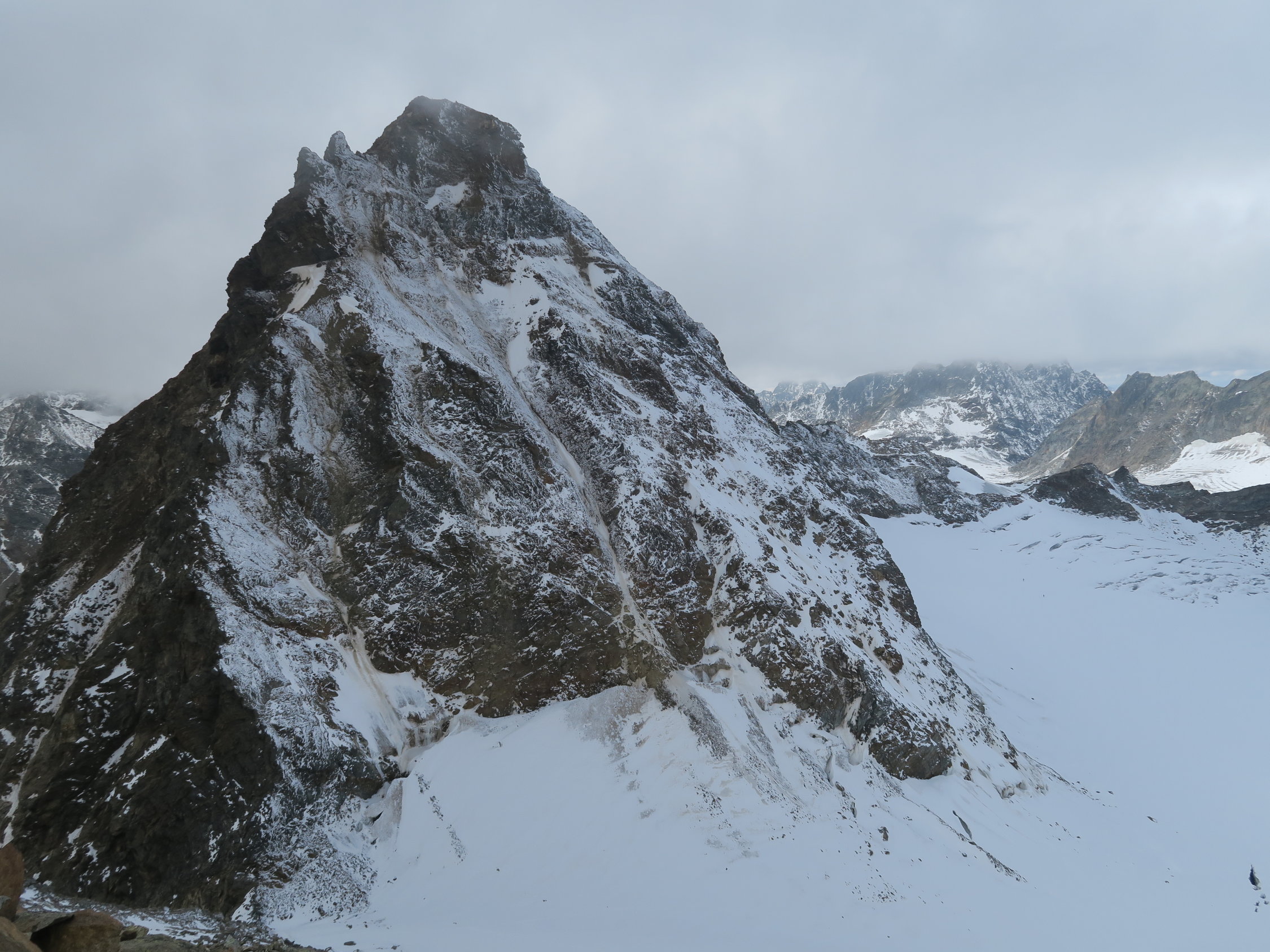 Ab ca. 2500 m beginnt die Schneedecke. Auf dem Gletscher perfekte Verhältnisse / Trittschnee, kein Blankeis. Steigeisen nur kurz in der Steilstufe angezogen. Gipfelaufstieg unter dem Kamin eisig aber mit Vorsicht gut zu meistern. Sonst ist der Gipfelaufbau nahezu schneefrei.