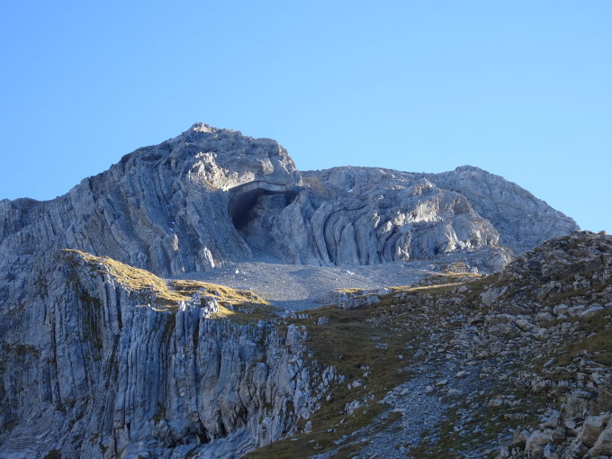 Langer Aufstieg im Schatten und entsprechend frisch. Trocken im Felsbereich. Äusserst instabiler Fels, jeder Griff muss geprüft werden. Steinschlag durch Steinwild nicht ausgeschlossen. Ein Helm wäre von Vorteil.