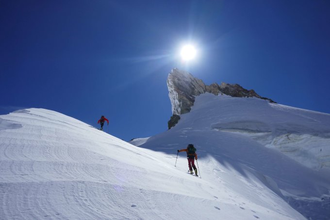 Top Verhältnisse. Die Nacht zuvor ist Schnee gefallen und wir konnten nach einer hablen Stunde zu Fuss schon die Felle aufziehen. Haben gespurt hinauf zum Refugio Meiling. Die Hütte war bereits offen und wir wurden bekocht. Am nächsten Morgen sind wir um 7.30 gestartet und waren in ca. 4H oben auf dem Gipfel. Oben war der Schnee pulvrig und zum Teil etwas wind gepresst. Unterhalb der Hütte dann schon frühlingshafte Verhältnisse.