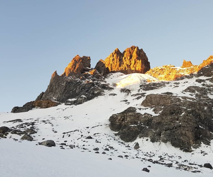 Der Weg zur Schlossberg Lücke gut markiert mit viel losen Schotter, der Gletscher mit wenig gutem Trittschnee bedeckt und der Fels trocken. Leider hat uns der Föhnsturm einen Strich durch die Rechnung gemacht- wir sind nach der ersten Seillänge umgedreht.