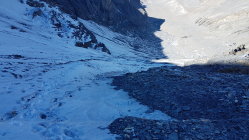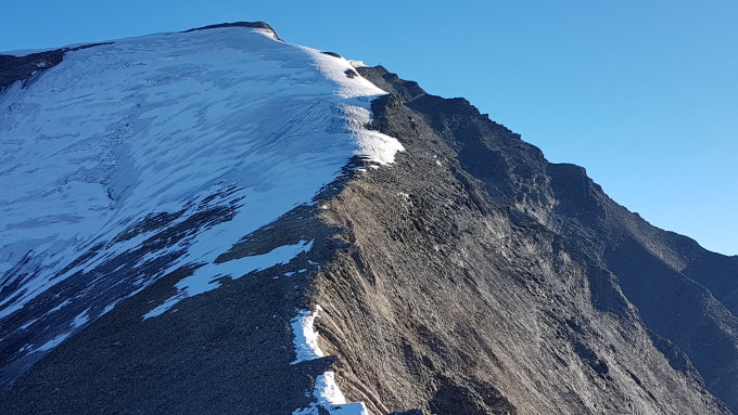 aper bis Flanke zum Zackengrat, dort gefrorener Altschnee, teilweise mit Felskontakt und mit Stellen Blankeis (können umgangen werden). Zackengrat größtenteils schneefrei bis zum letzten Abstieg vor Beginn Anstieg Vorgipfel. Eisfeld Vorgipfel (morgens) hart und griffig, Stellen Blankeis, können umgangen werden.