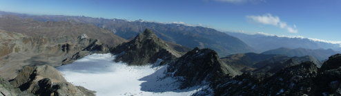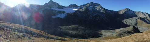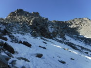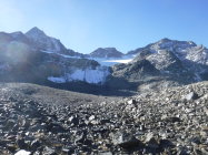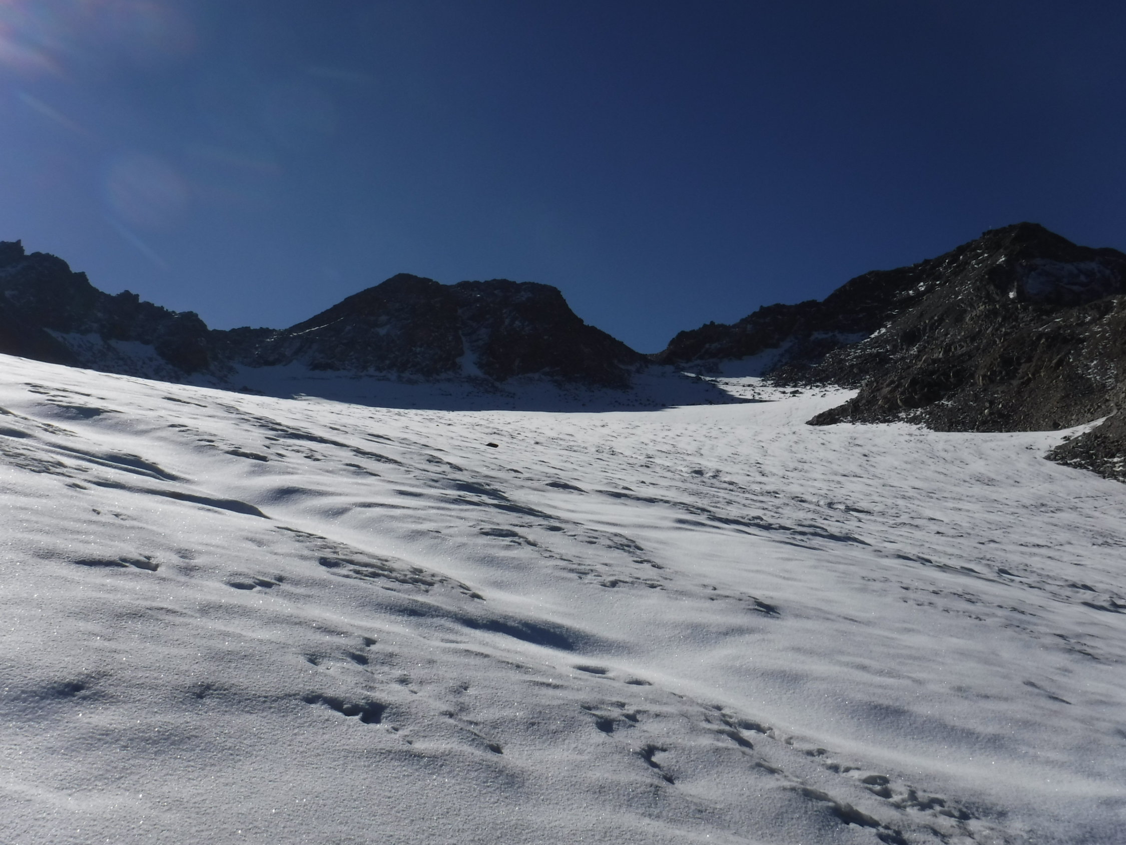 Tourenbeginn um 06:30 Uhr bei 2°C und leichtem Wind. Ca. 5 cm dicke verfirnte Schicht auf dem Gletscher, nur wenige blanke Stellen. Beim oberen Ende des Gletschers waren Steigeisen von Vorteil. Pickel benötigte ich nicht. Die Teleskopstöcke waren bei diesen Verhältnissen ausreichend. Die Steine auf der Nordseite waren mit einer Reif-Schicht beaufschlagt, was die Passage im unteren Bereich des Ostgrats etwas heikel machte (Rutschgefahr).