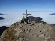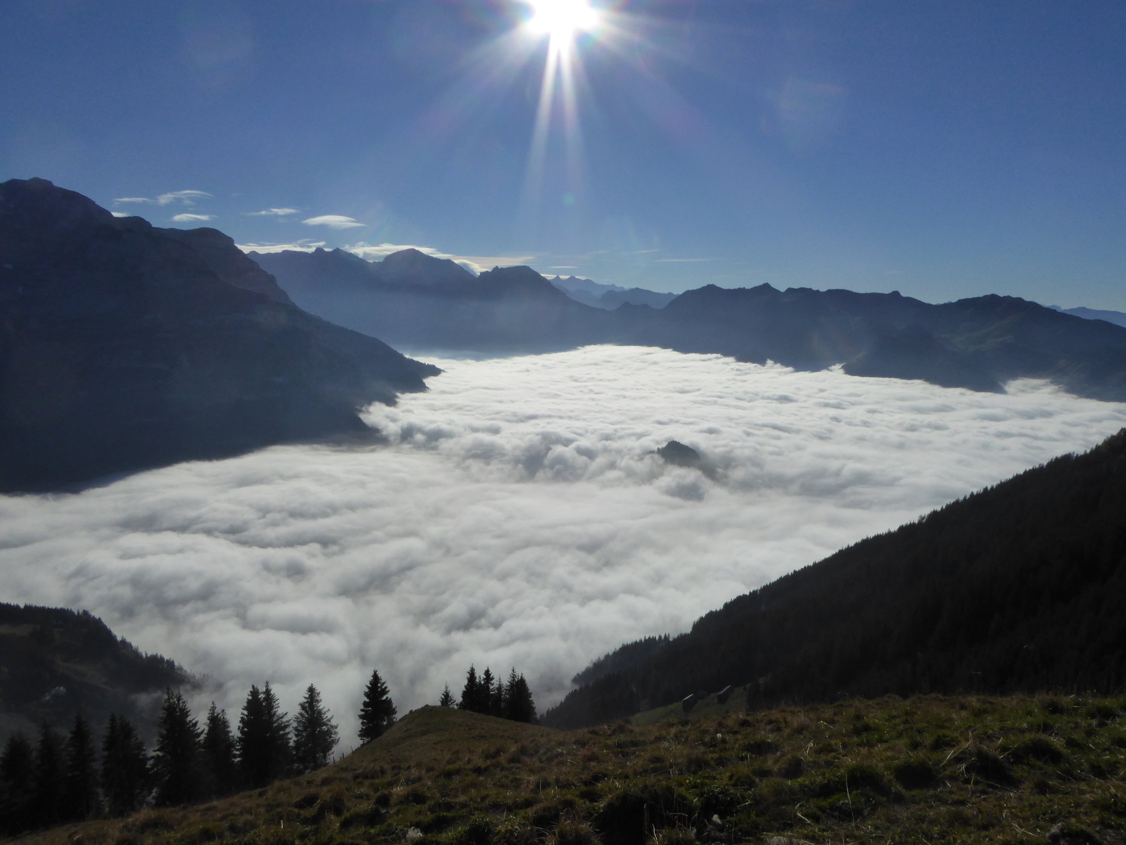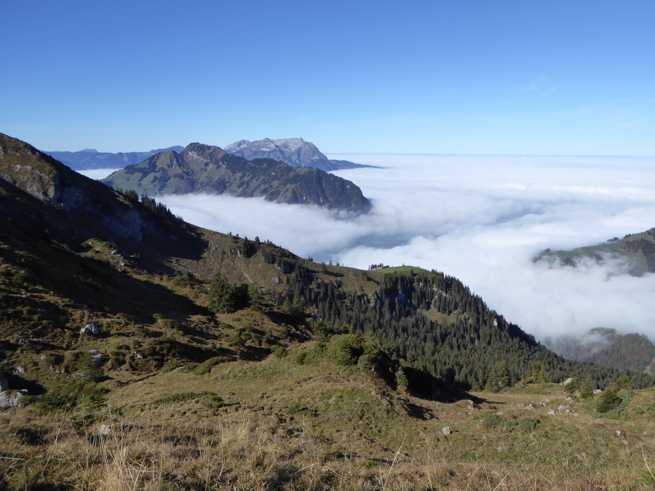 Schöner Herbsttag, blauer Himmel mit wenig Höhenbewölkung. In der Sonne noch warm, im Schatten bereits empfindlich kühl. Es ist so trocken, dass jeder kräftige Windstoss auf dem Gipfel Staub aufwirbelt. Wind von Südwest. Auf dem Gipfel um 14:30 Uhr 12 Grad. Um diese Uhrzeit hebt sich der Nebel merklich. Aufzug von hohen Wolken bis zum Abend.