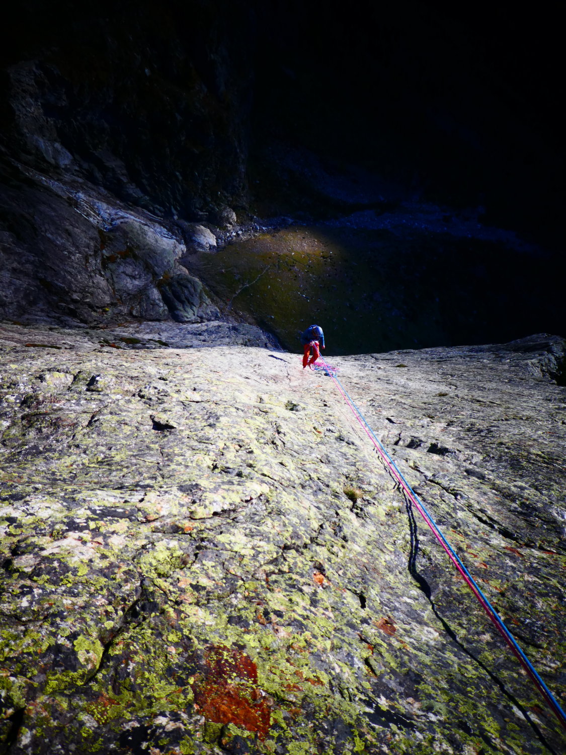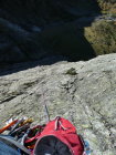 Die Durststrecke führt ziemlich gerade nach oben. Meiner Meinung nach ist es nicht immer ein logischer Routenverlauf. Dafür zieht die Schwierigkeit mit jeder Seillänge etwas an. Anfangs war es noch etwas rutschig, weil die Flechten noch feucht waren. Später, als die Sonne kam, trockneten diese rasch. Die ersten Seillängen sind vor allem Plattenschleicherei mit oft grossen Tritten und Slopern. Weiter oben wird es immer feingriffiger und steiler.