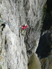 Die Hakenabstände sind alpin und die Route lässt sich, ohne Hammer und Nägel, kaum zusätzlich absichern. Erst im oberen Wandteil hat es z.T. Risse, in die mann einen Friend stopfen kann. Das empfiehlt sich allerdings nicht, weil man sich dadurch gute Griffe versperrt. Wer trotzdem Mobile sicherungsmittel mitnimmt braucht nicht mehr als Friends 0.5, 0.75, 1 und ev. ein paar wenige Keile.