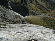 Der Zustieg führt vom Parkplatz an der Grimselpassstrasse über einen gut ausgetretene Pfad zum Wandfuss und ist auch für jene, die sich gerne verirren kein Problem, da die imposanten Wände der Mittagflue immer zu sehen sind. Als wir die Wand erreichten, war bereits eine Seilschaft in der 1. SL von "Am Ueli sis Chueli". Später kamen noch vier weitere Seilschaften an. Jede stieg in eine andere Route ein. So wurde an diesem Sonntag jede Route der Südwand einmal geklettert, ein schönes Bild.
