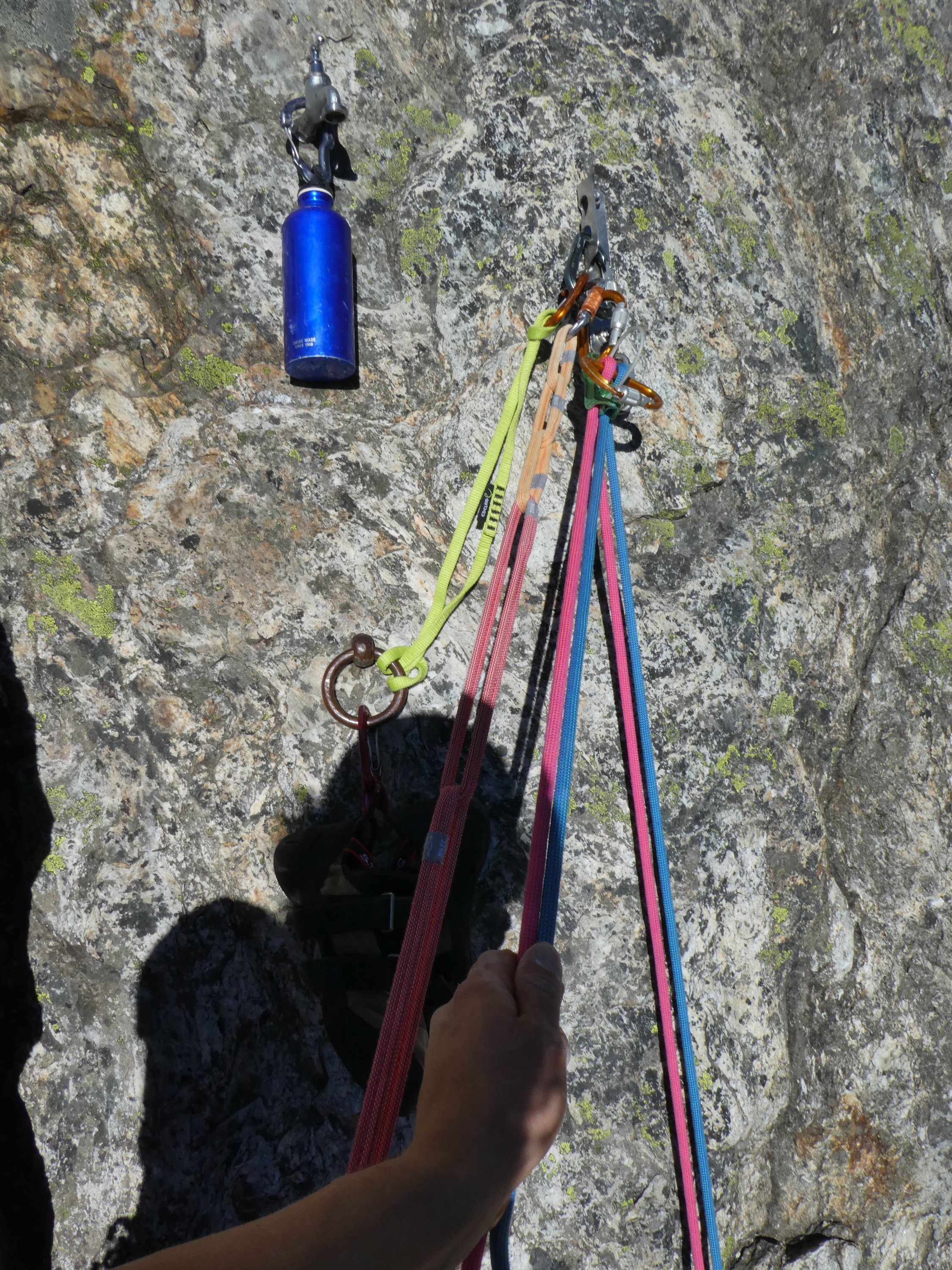 Wir waren mit 60m Halbseilen unterwegs und das ist auch unbedingt zu empfehlen, denn damit kann man beim Abseilen z.T. einen Stand überspringen. Sollte mal jemand ein paar meter über dem Stand baumeln, dann kann er anstelle von abklettern, an den Abseilstand einer anderen Route pendeln.