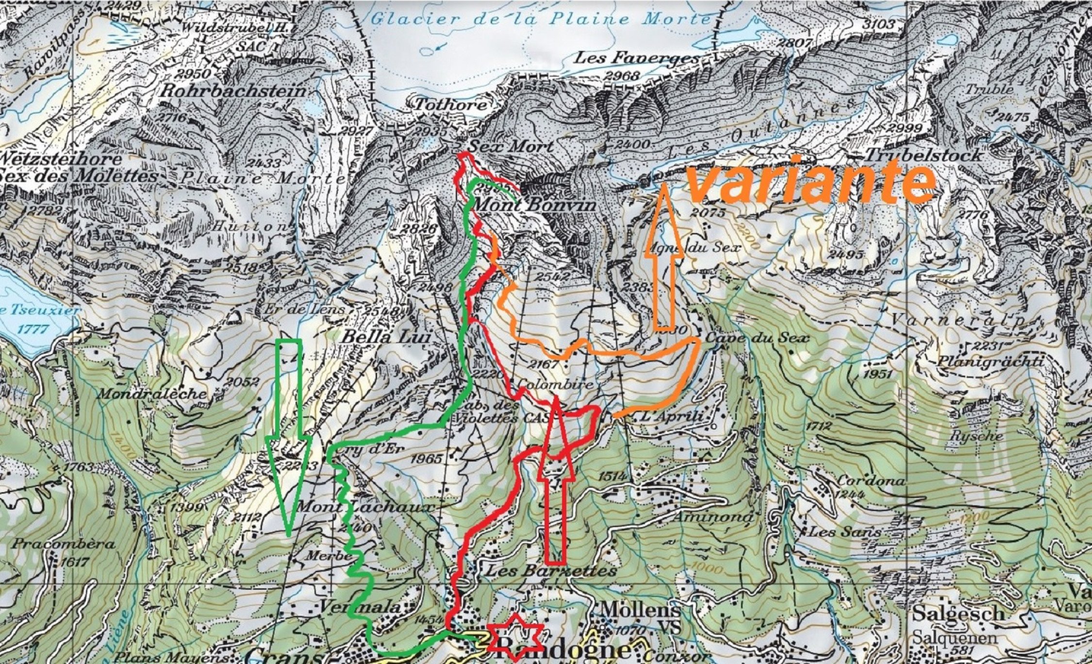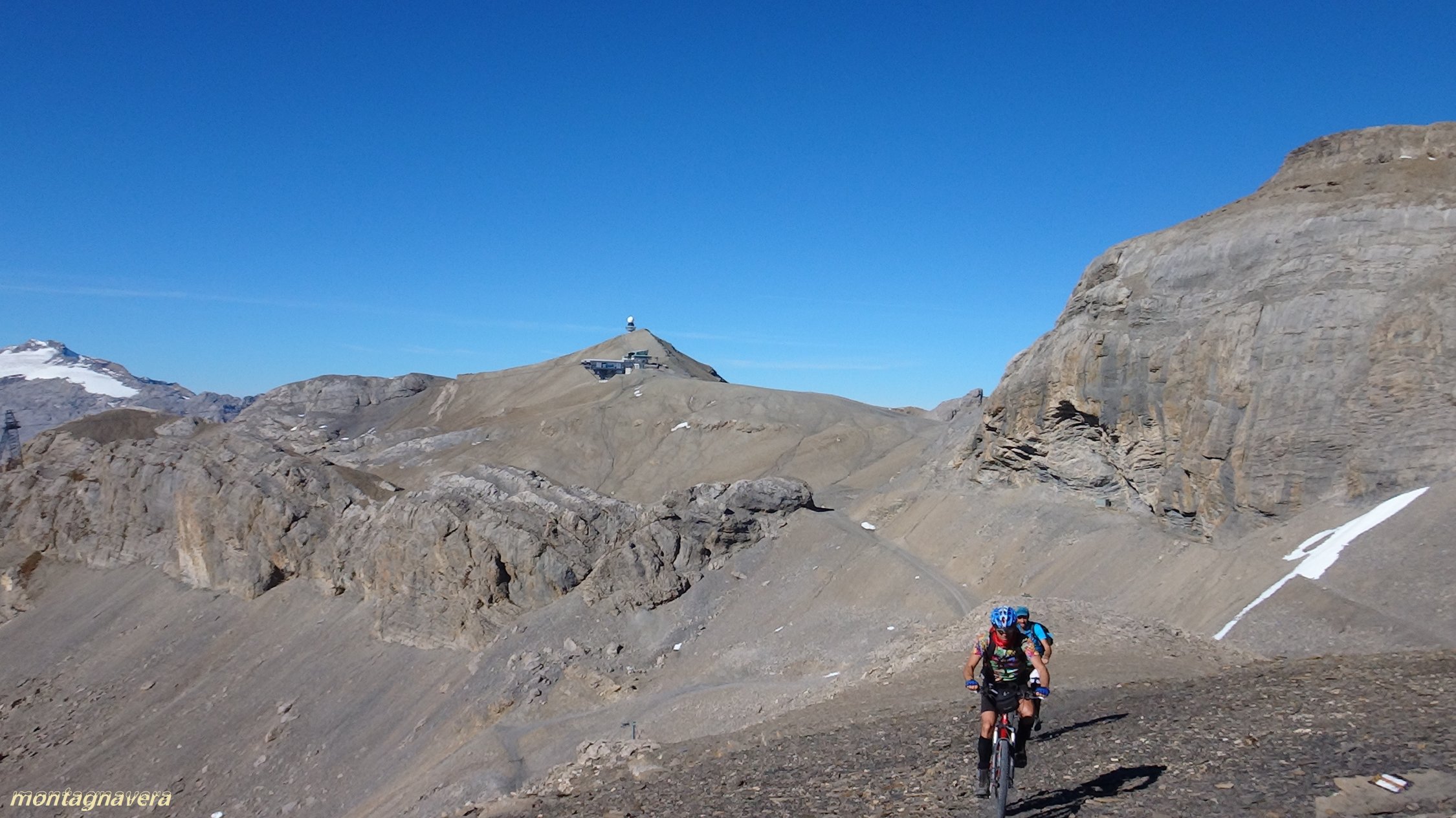 Von Crans Montan fur di touren nach Plaine Morte Gletscher Von Crans Montana fur skipiste nach Plaine Morte, ab etwa 2850m.u.m. richtung Recht nach Mont Bonvin, Faharrad/push 60-40% mit Ebike 90/10%. Abfahrt als Bergfahrt, dann am 2350m.u.m richtun SW nach Cabanne des Violettes- Cry D'Er und Crans Montana