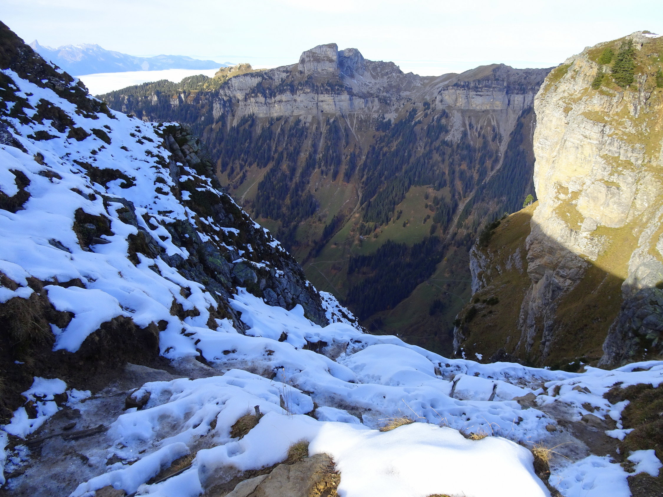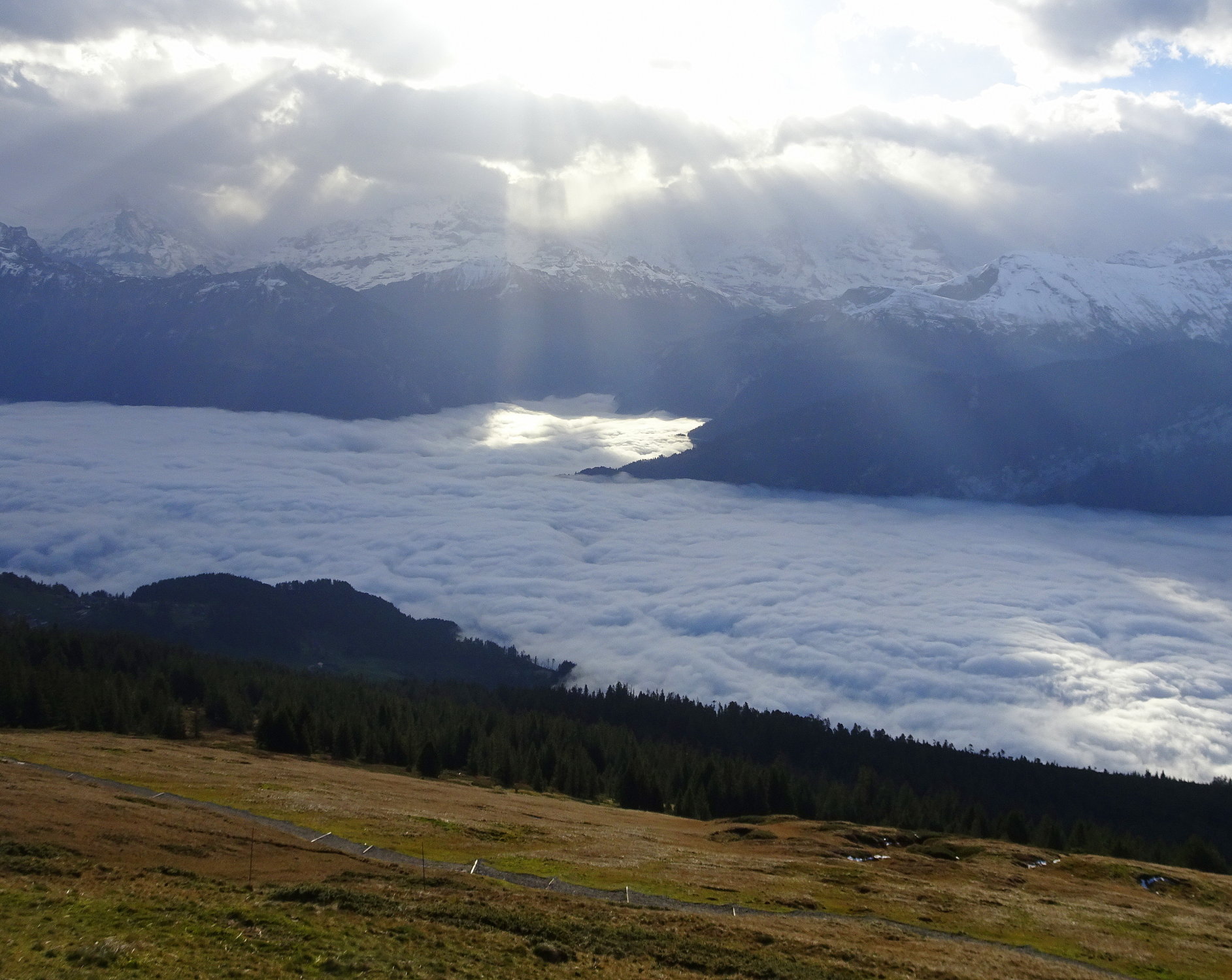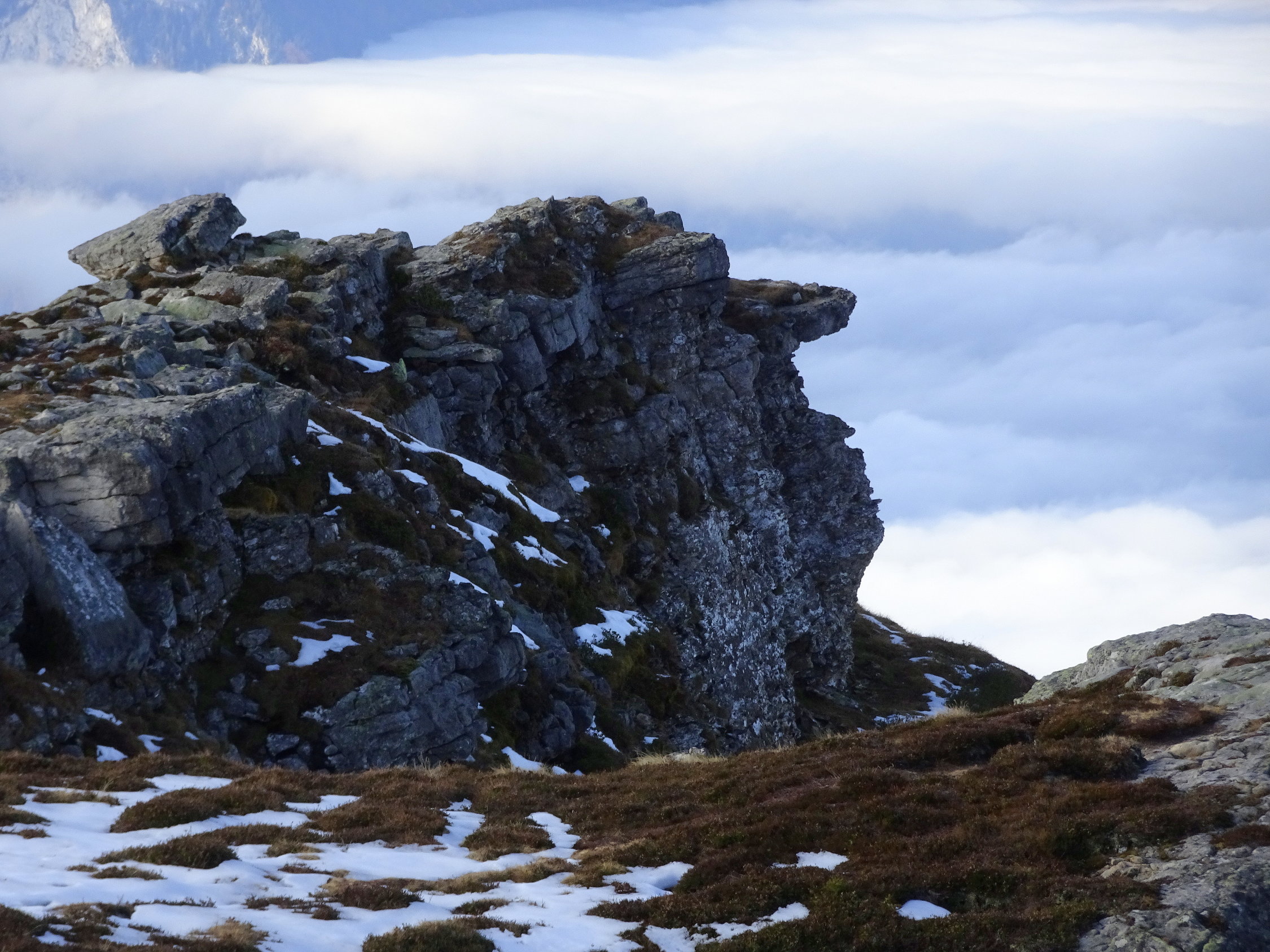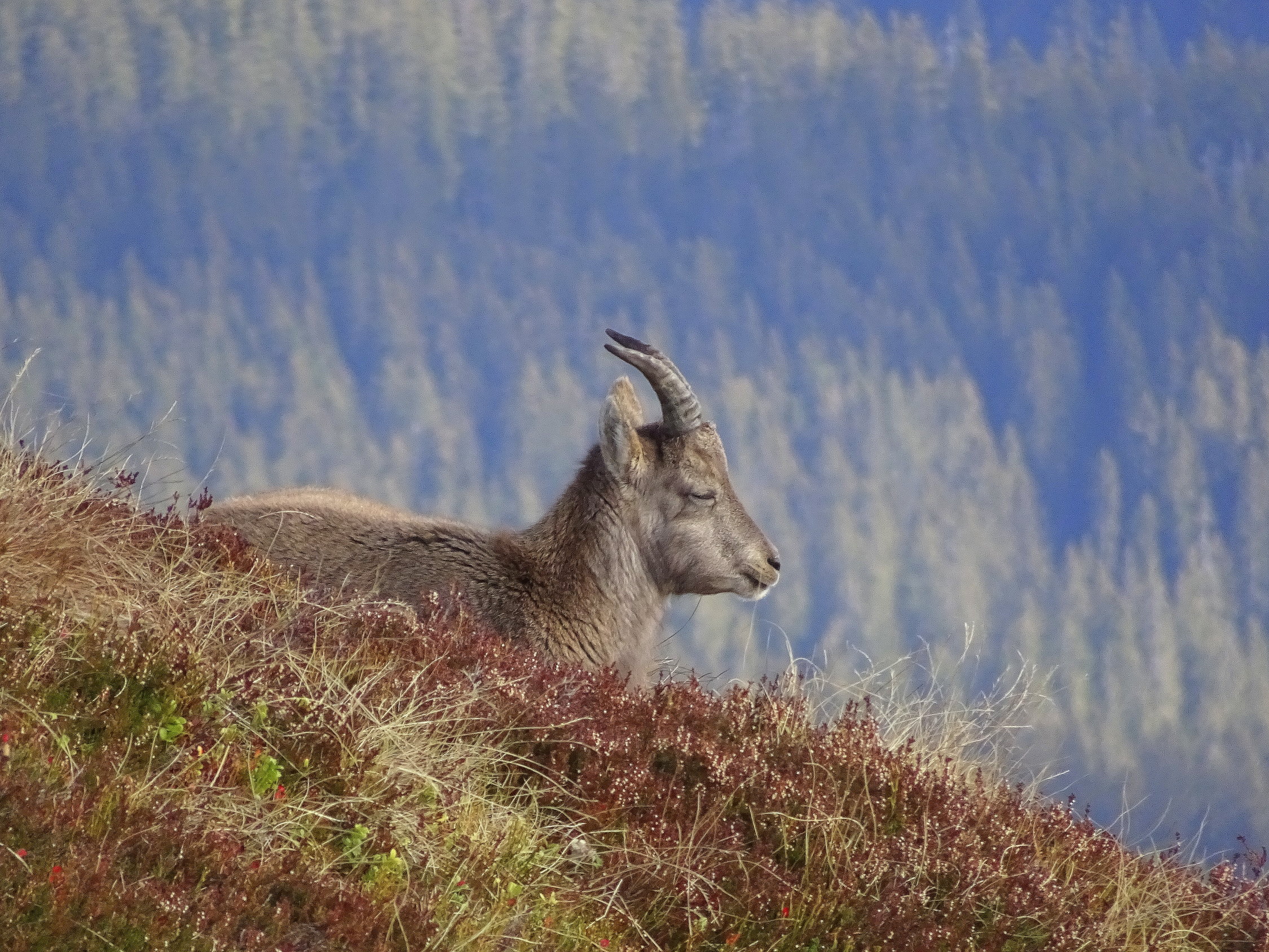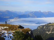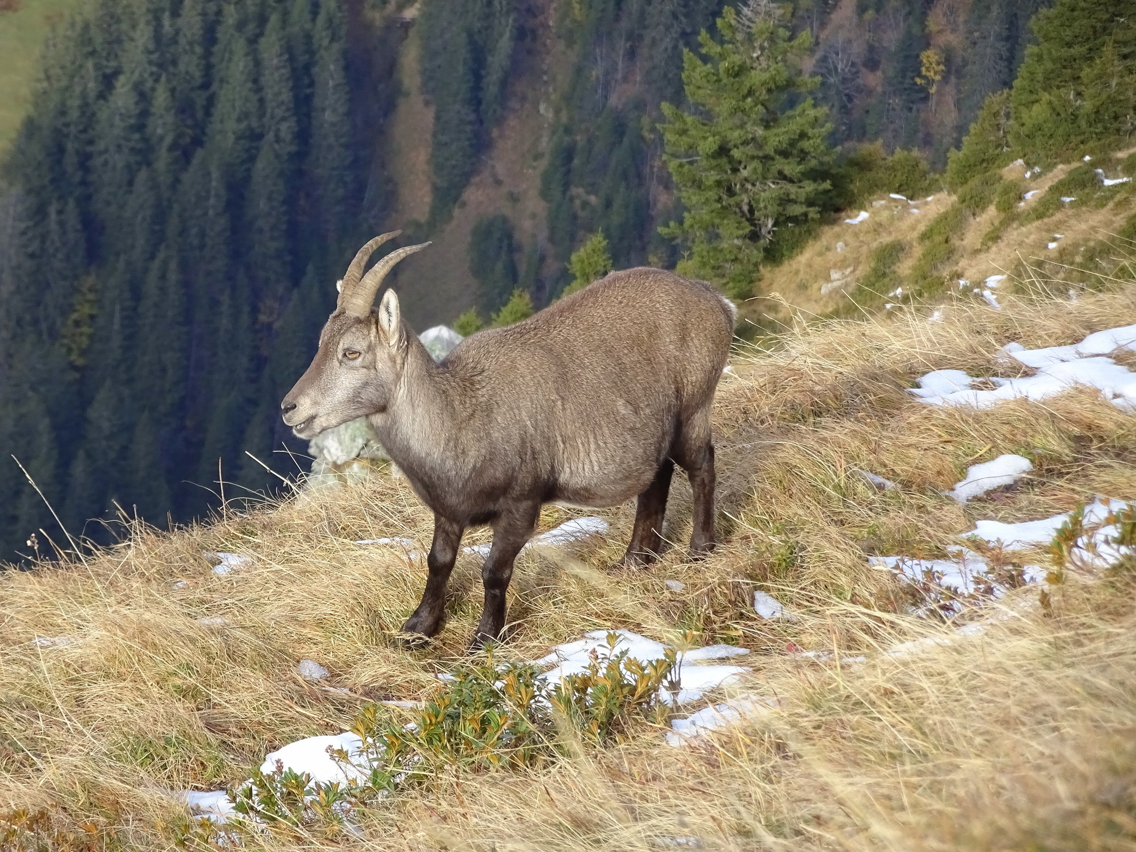 Hochnebelmeer ist angesagt, also sind Niederhorn, Burgfeldstand und Gemmenalphorn eine sichere Adresse. Was nicht klappte, war der Föhn der nicht erst zum Montag, sondern schon Sonntagsmorgen in den Berneralpen mit grossem Wolkenaufgebot wirkte. Also nichts mit dem üblichen Menu: Blauer Himmel, Schneeberge, Hochnebelmeer = schöne Bilder. Da versucht man das Beste aus der Situation zu machen. Gottlob haben wenigsten die Steingeissen mit ihren Jungen und ein freischaffender, jungen Steinbock für etwas Folklore gesorgt. Die Ältere Böcke waren vollständig abwesend, Eine Gruppe Gämse war auch da, aber viel zu weit weg.