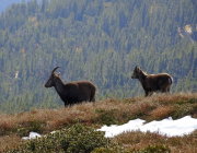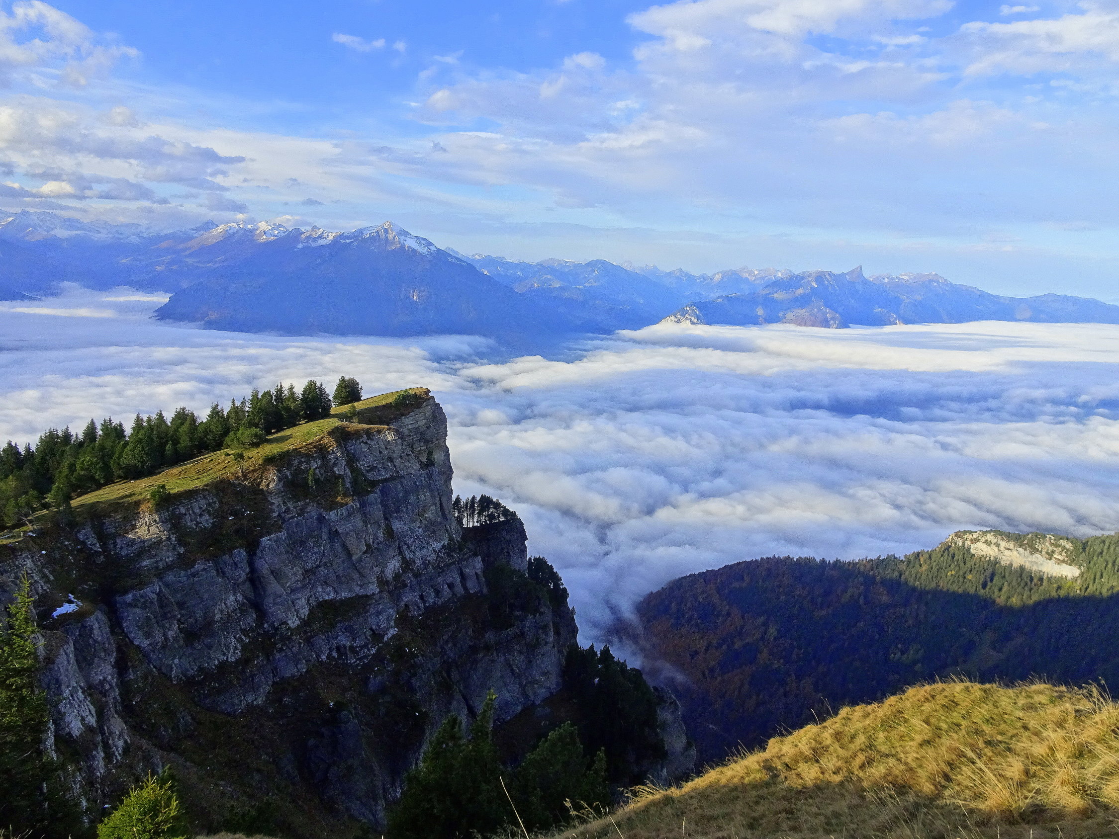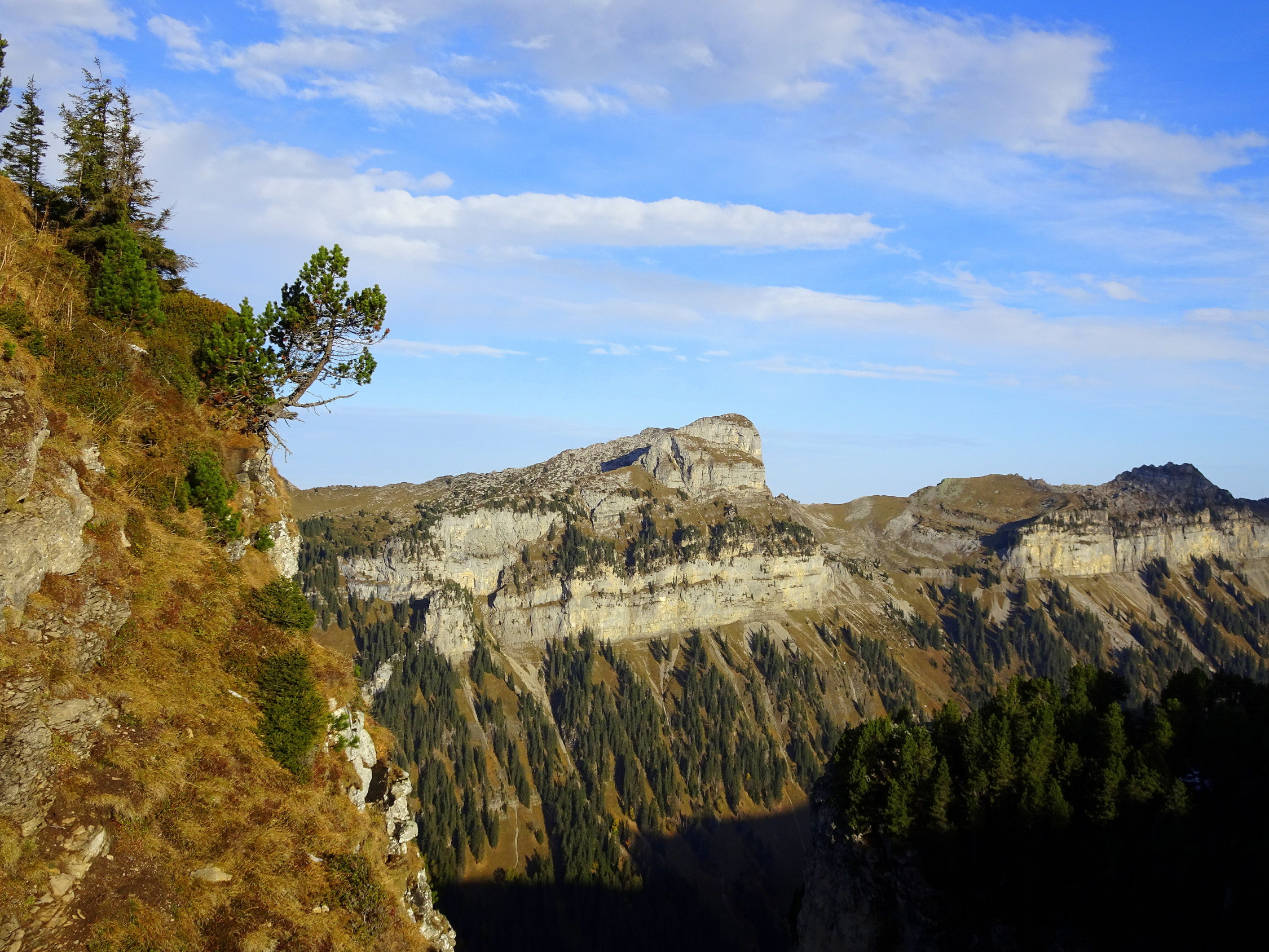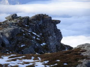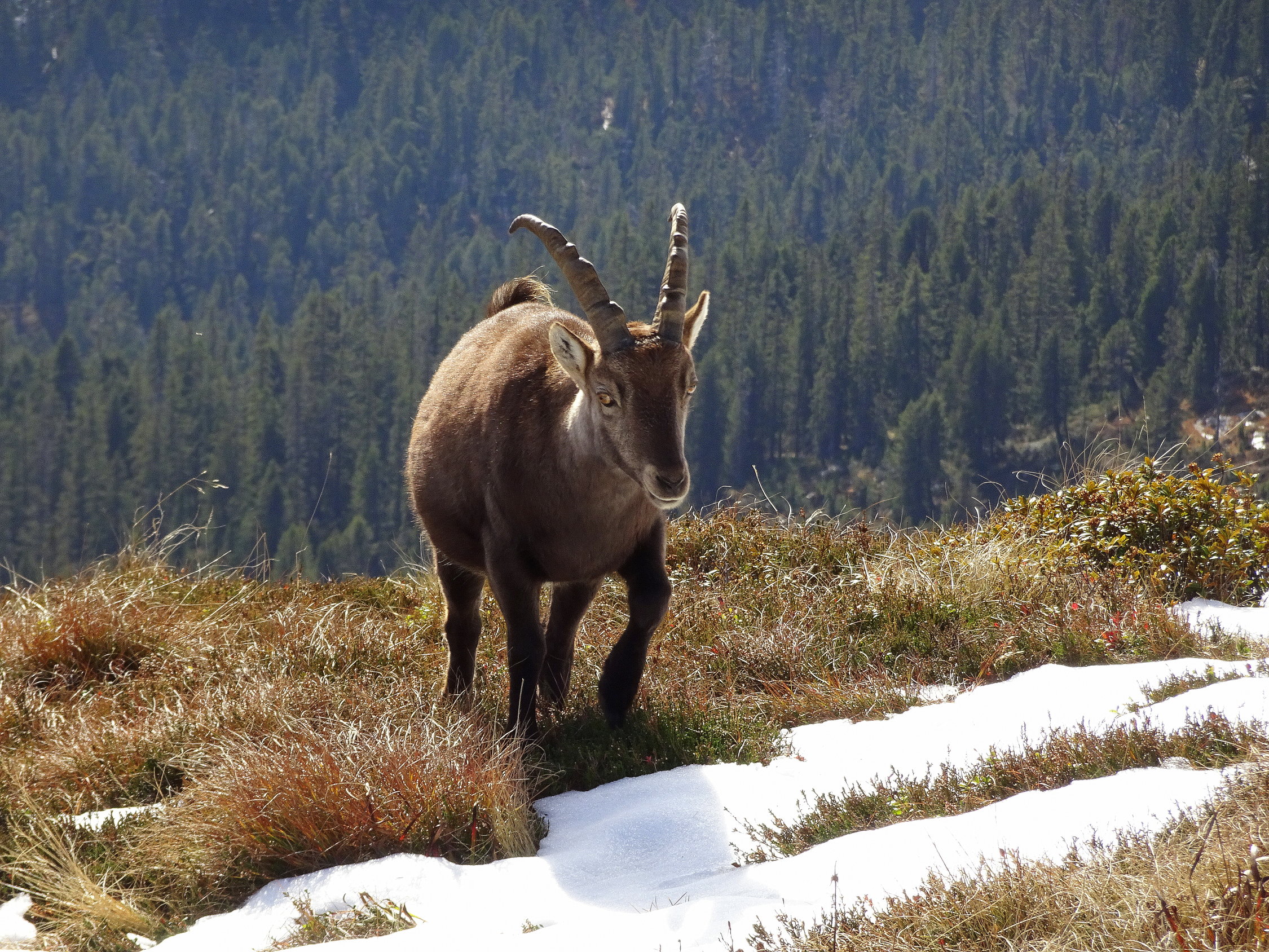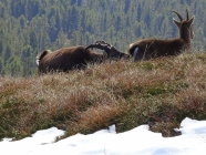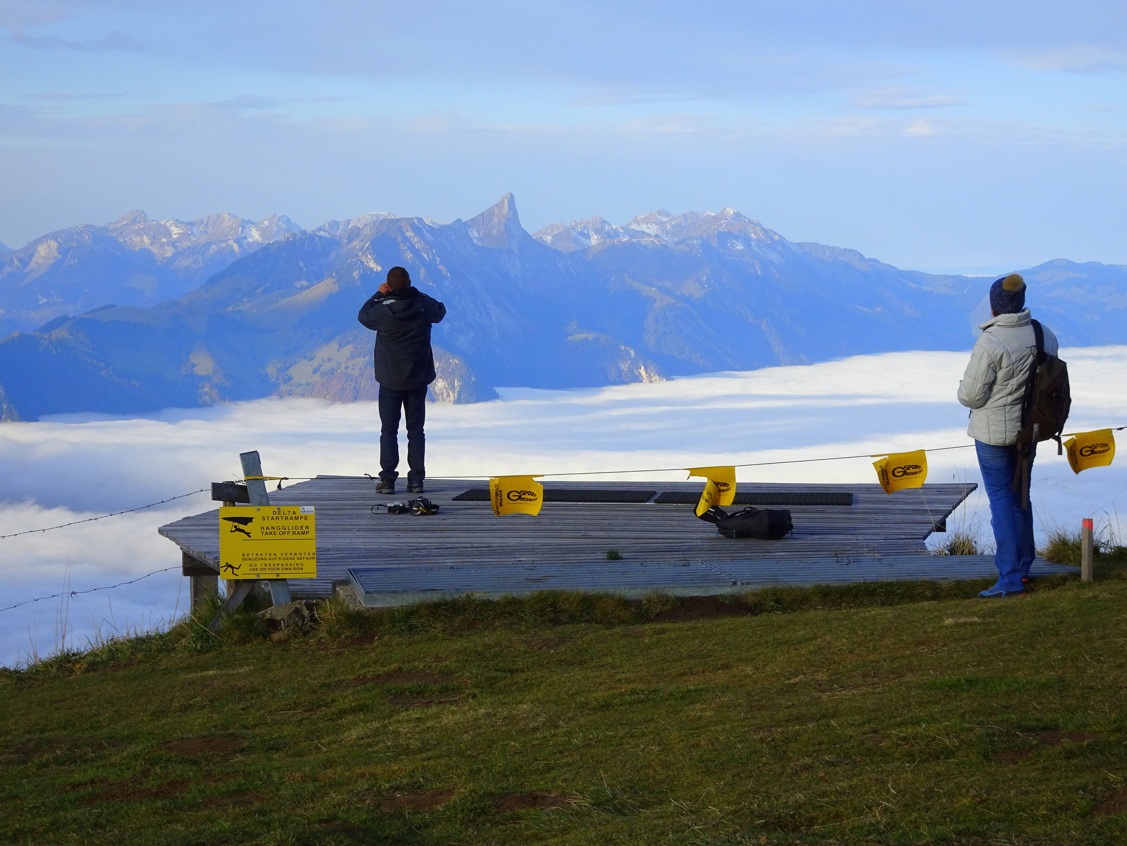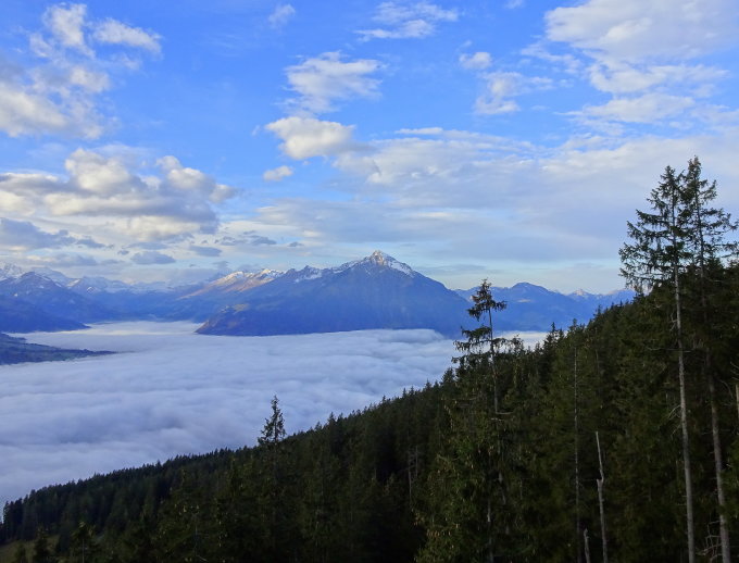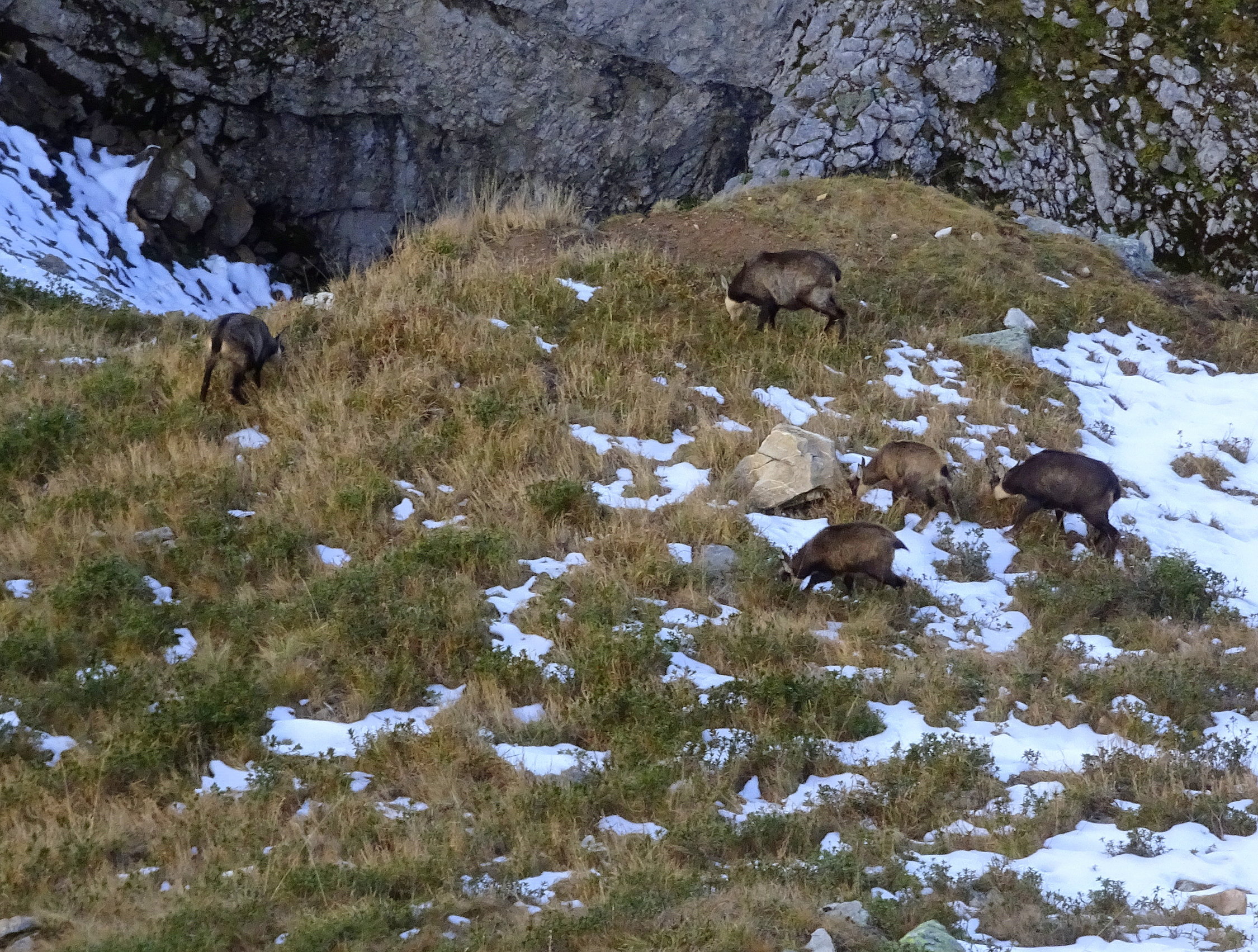 Hochnebelmeer ist angesagt, also sind Niederhorn, Burgfeldstand und Gemmenalphorn eine sichere Adresse. Was nicht klappte, war der Föhn der nicht erst zum Montag, sondern schon Sonntagsmorgen in den Berneralpen mit grossem Wolkenaufgebot wirkte. Also nichts mit dem üblichen Menu: Blauer Himmel, Schneeberge, Hochnebelmeer = schöne Bilder. Da versucht man das Beste aus der Situation zu machen. Gottlob haben wenigsten die Steingeissen mit ihren Jungen und ein freischaffender, jungen Steinbock für etwas Folklore gesorgt. Die Ältere Böcke waren vollständig abwesend, Eine Gruppe Gämse war auch da, aber viel zu weit weg.