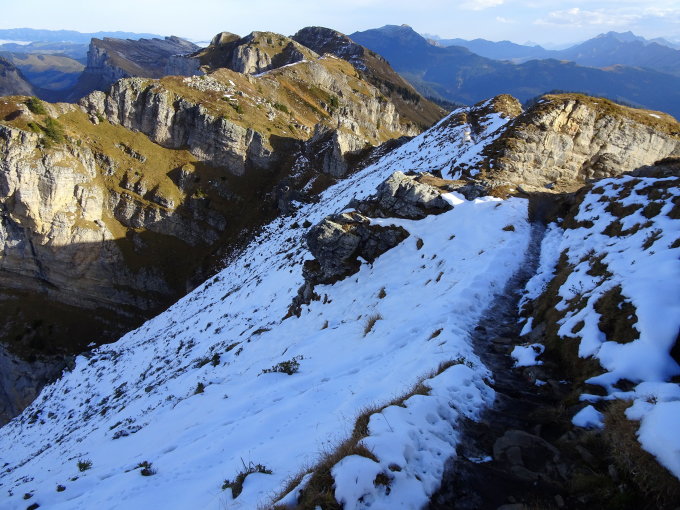 Mehrheitlich gut. Nordseitig einige schneebedeckte Partien. Die Spuren werden im Verlauf des Tages weich und nass, in der Nacht gefrieren sie, so ist es am Vormittag teilweise heikel und rutschig. Stöcke sind hilfreich.