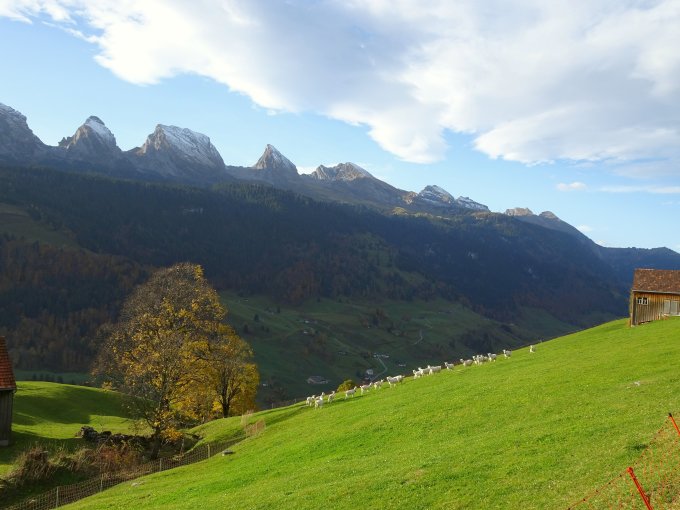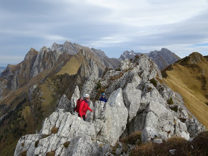 Wenn auch durch Nässe und glattes Gras im Spätherbst nicht mehr ganz optimale Bedingungen, insgesamt eher gemässigtes T5. Trittsicherheit und Schwindelfreiheit dennoch unabdingbar. Wetter warm, nur teilweise sonnig und in exponierten Lagen föhnbedingt starker Wind.