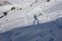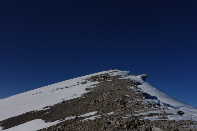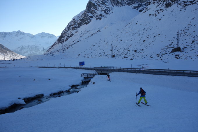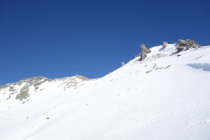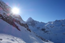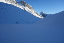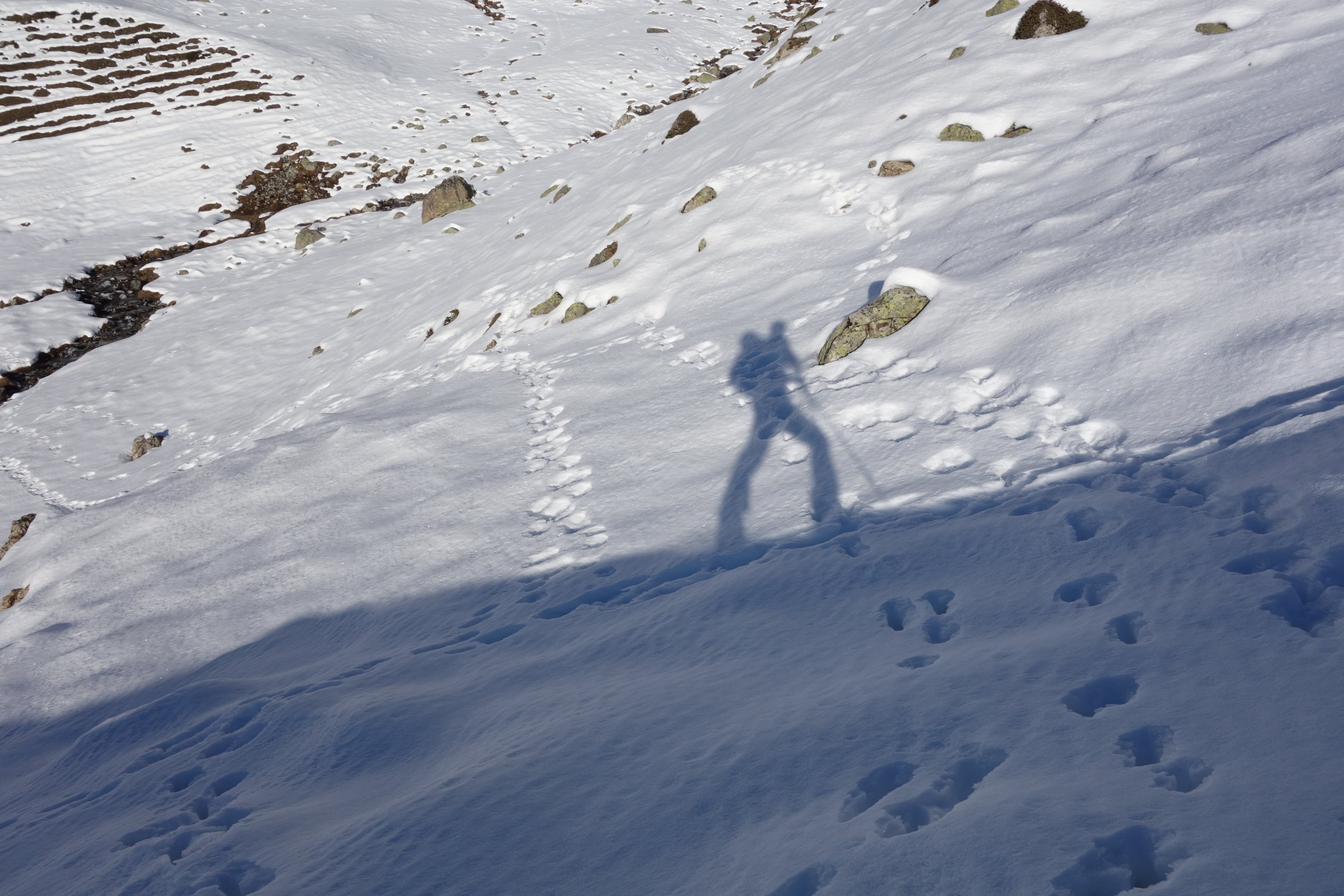 Frostiger Start um 9:15 ab Alp Güglia. Am Parkplatz 3 von 5 Parkplätzen belegt. Unten 40cm festgefrorene Schneeauflage die fast schon alle Steine überdeckt. Ab 2600m ging der Schnee von hart zu pulvrig über. ca. 5-10cm lockere Auflage, teils mit Deckel.