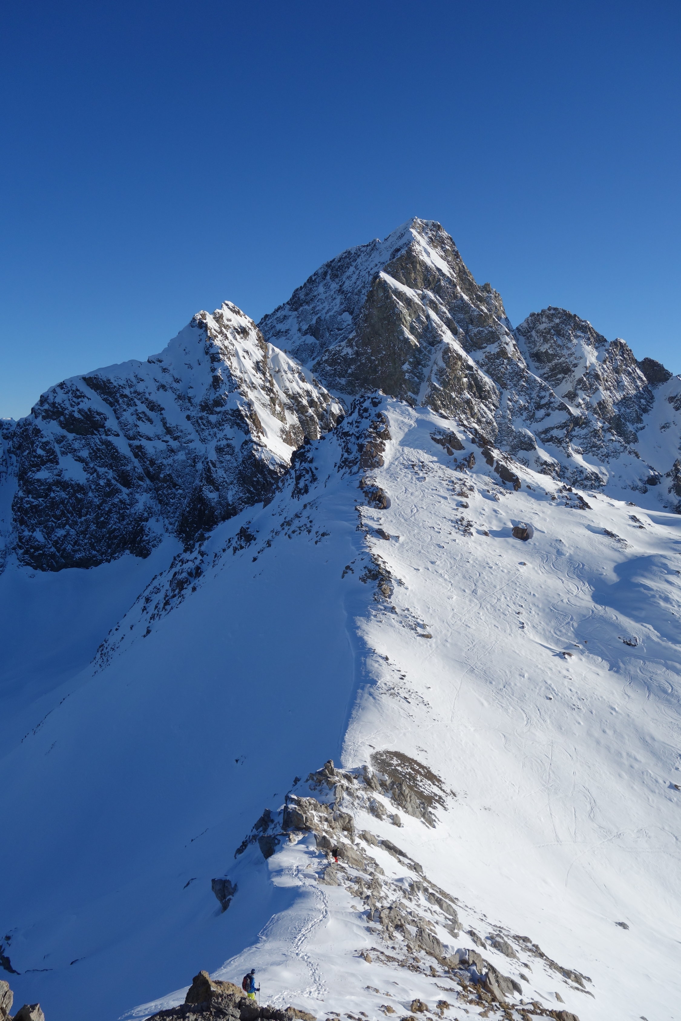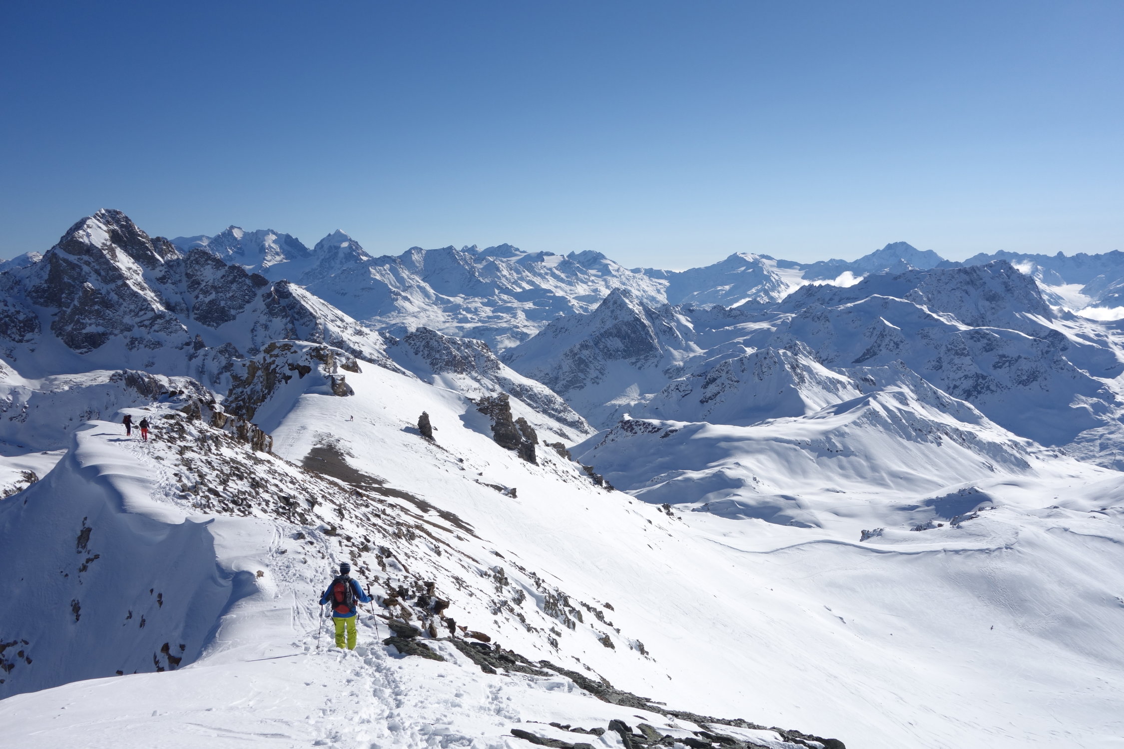 Im Gipfelhang waren mit den Splitboard Harscheisen sehr von Vorteil, ansonsten konnte man mit den Ski`s bis ca. 30hm unter den Gipfel aufsteigen. Der Grat war vom Wind und Sonne aper, daher gings zu Fuss weiter. Am Gipfel Windstill. Sind dann über Crap Alv noch zum Corn Suvrette. Die 30min Fussaufstieg sind eher Wandern. Corn Chamuotsch gegenüber, kann komplett mit Ski bestiegen werden, aber sieht auch noch etwas steinig aus.