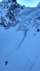 Ab Buinlücke wenig Felskontakt, Schneeauflage nur mäßig verfestigt, die Nordseite hat eisigen Anraum, dadurch sind viele Bohrhaken in den Kaminen nicht auffindbar.