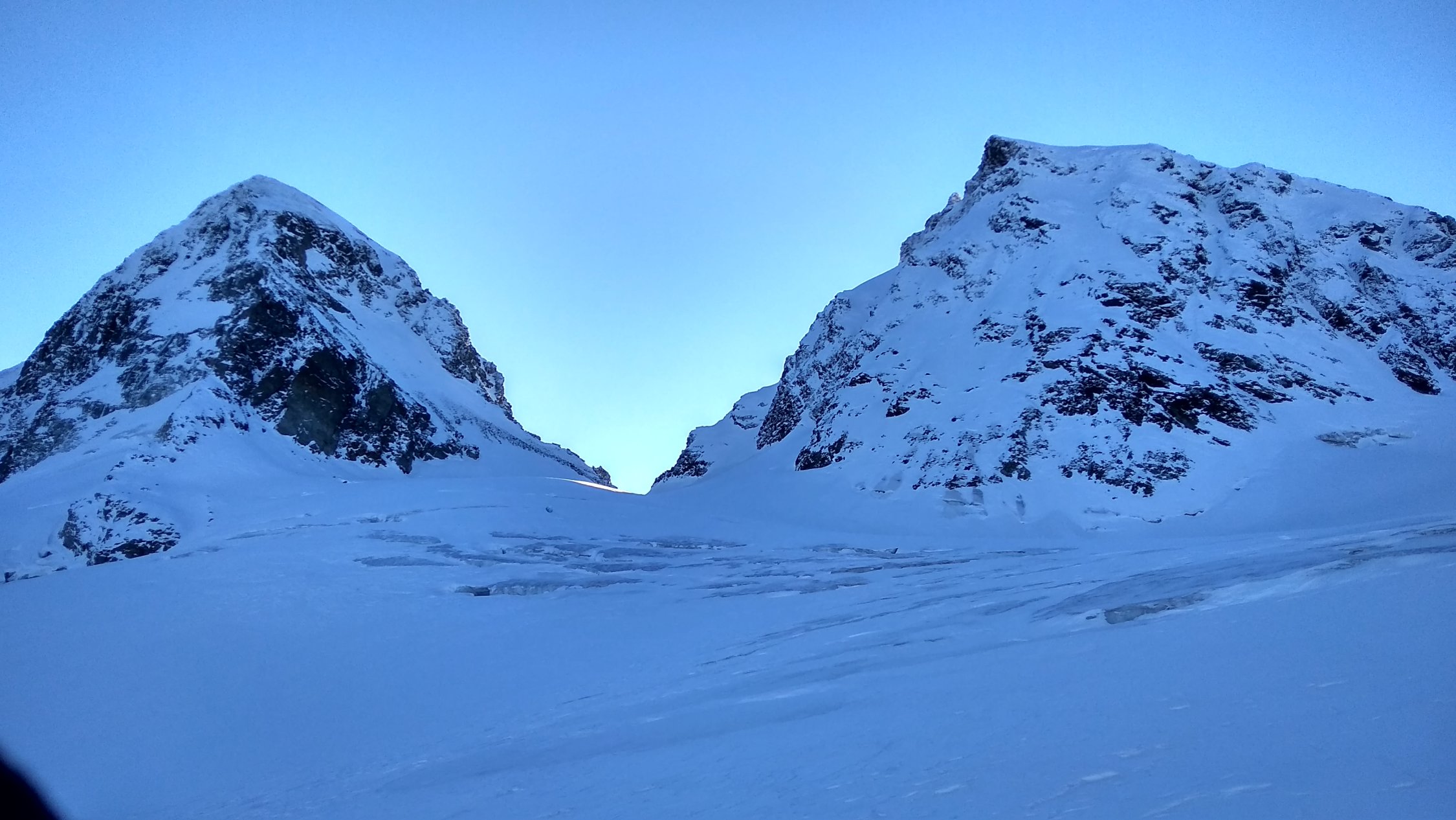 Ab Wiesbadener Hütte durchgehende Schneedecke, im unteren Teil mühsamer Bruchharsch, ab ca. 2700Hm tragender Deckel.