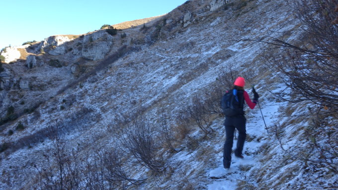 Nach dem Schneefall vom Montag liegt ab ca. 1400 m überall eine dünne Decke aus ca. 2 cm Pulverschnee. Die Rutschigkeit hält sich in Grenzen. Wer unsicher ist sollte evtl. noch Grödeln mitnehmen. Es geht aber wirklich gut ohne. Tourenstöcke sind sehr empfehlenswert.