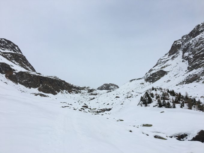 Ab 2800m ändert sich die Schneesituation dann rapide. Es liegt deutlich mehr Neuschnee und man muss auf frische Triebschneetaschen aufpassen, die verführischen Abfahrtsgenuss verprechen.