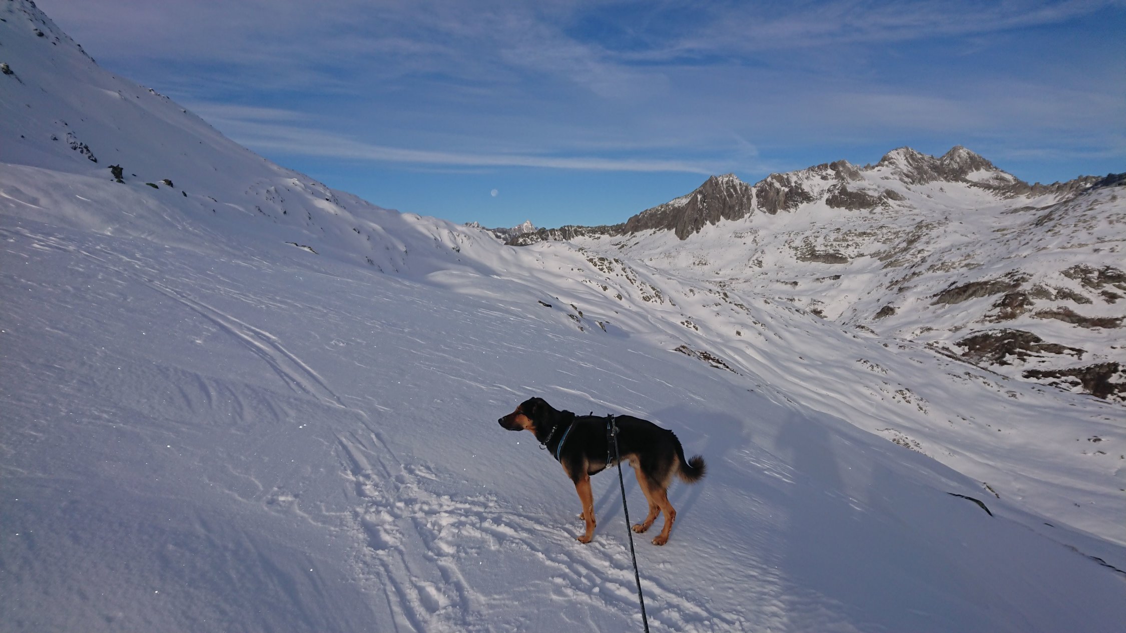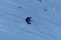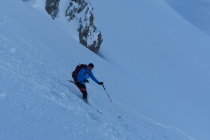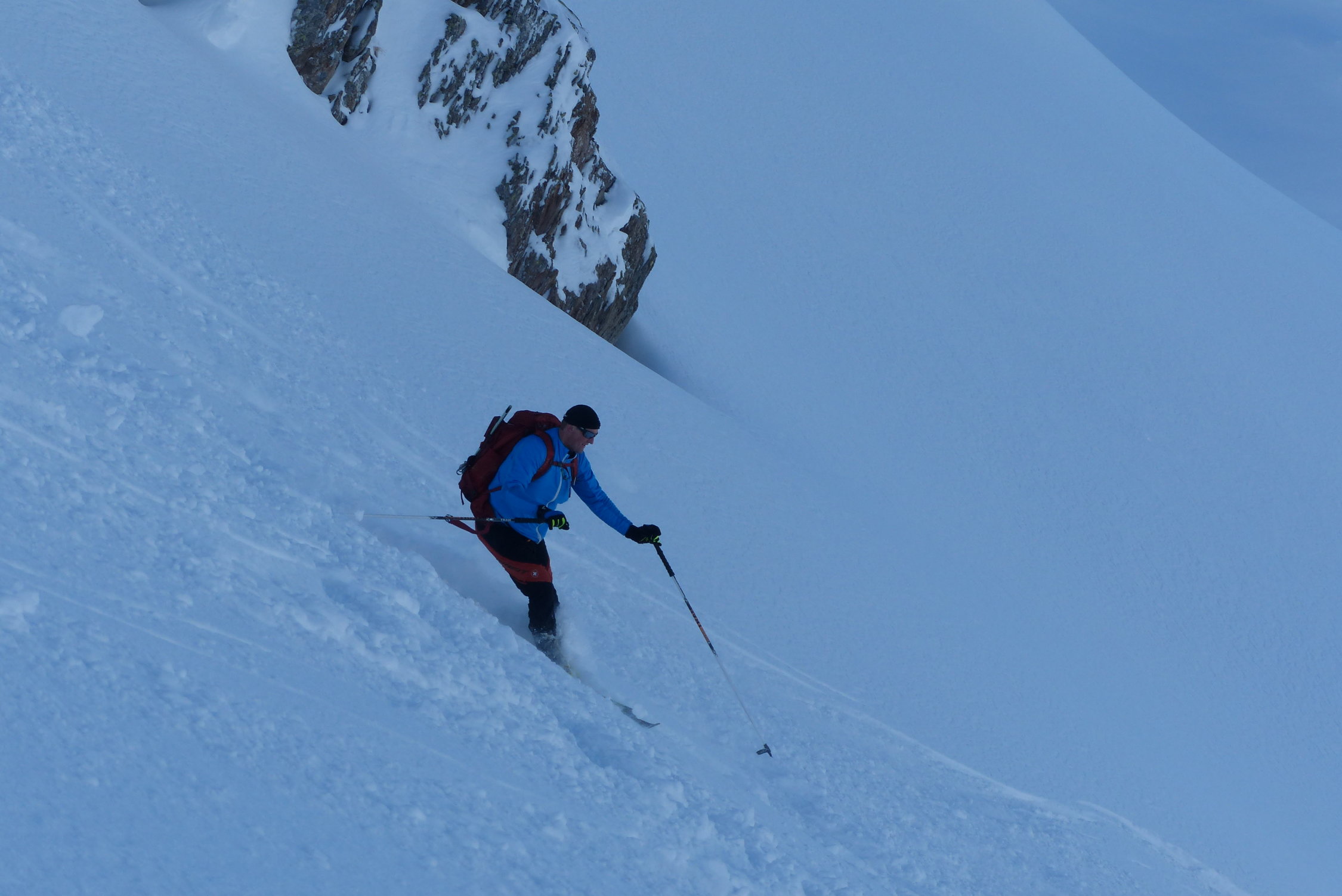 Abfahrt sehr gute Verhältnisse , Pulverschnee , niet Steinkontakt, teilweise Stellen mit Windharsch oder an den Übergängen abgeblasen. Die Altschnee Decke ist praktisch überall tragend.