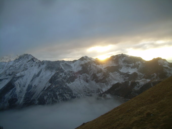 Samstag Nachmittag brachen wir von Malbun aus via Vaduzer Täli bei entzückender Licht- und Landschaftsstimmung auf zur "Adler"-Hütte, dem gemütlichen Winterquartier der Pfälzer Hütte. Mit uns waren dort nur zwei weitere Gäste, plus deren drolliger Labrador "Louie". Vom schlechten Samstagwetter blieben während unseres Hüttenaufstieges jediglich die Restbewölkung, sowie erfrischende Temperaturen. Wenig Schnee, kein Wasser um die Hütte herum, sodaß Schneeschmelzen angezeigt war. Da praktisch vom Boden weggekratzt, schwamm in der Folge dann auch das eine oder andere Kieselsteinchen im Abendmenü mit ...