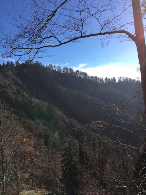 Trotz Glatteis auf der Strasse und nassem Laub im Zustieg durchs Bäretobel, präsentierte sich der Sporn komplett trocken. Die Route weist in der Zwischenzeit ordentliche Tritte auf und die entscheidenden Wurzelgriffe sind frei gelegt. Trotzdem scheint mir T5 angebracht, auch wenn die Kletterei sicher und der Untergrund meistens solide ist, hätte ein Rutscher verheerende Konsequenzen.