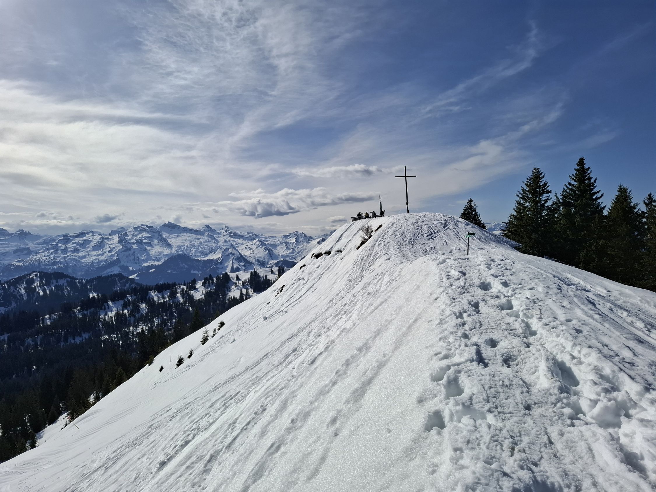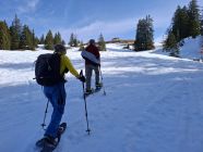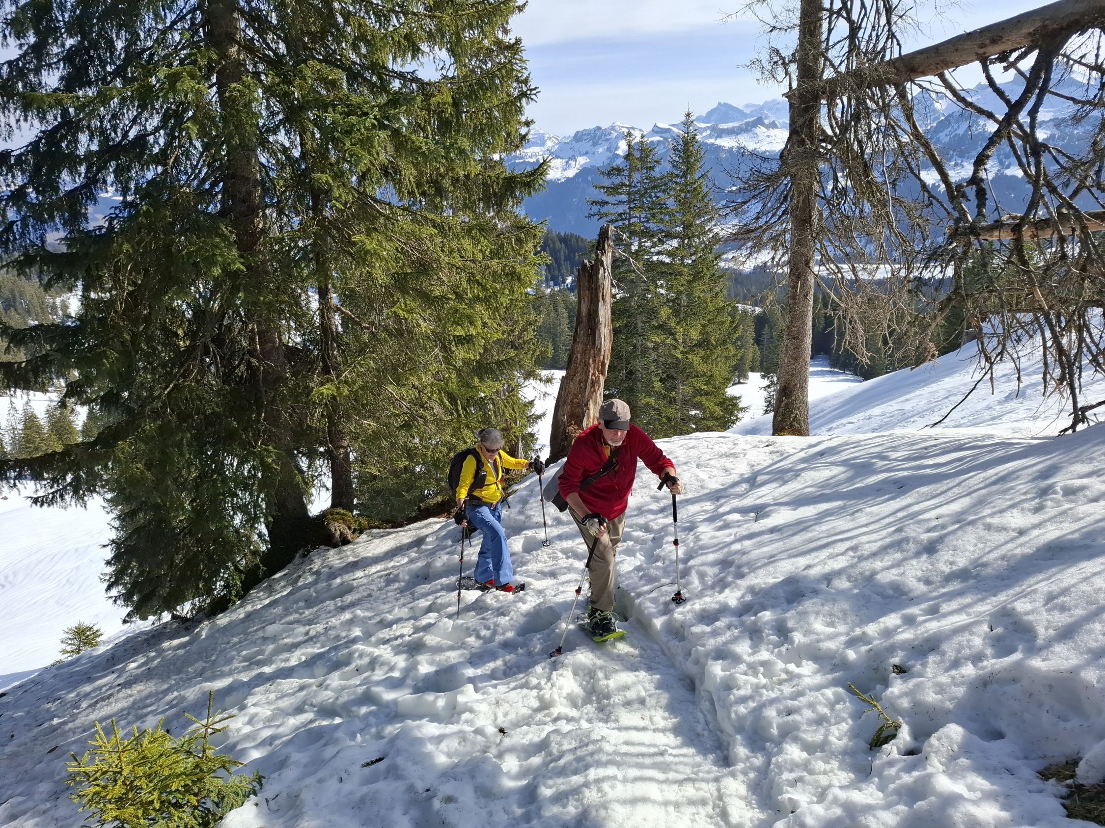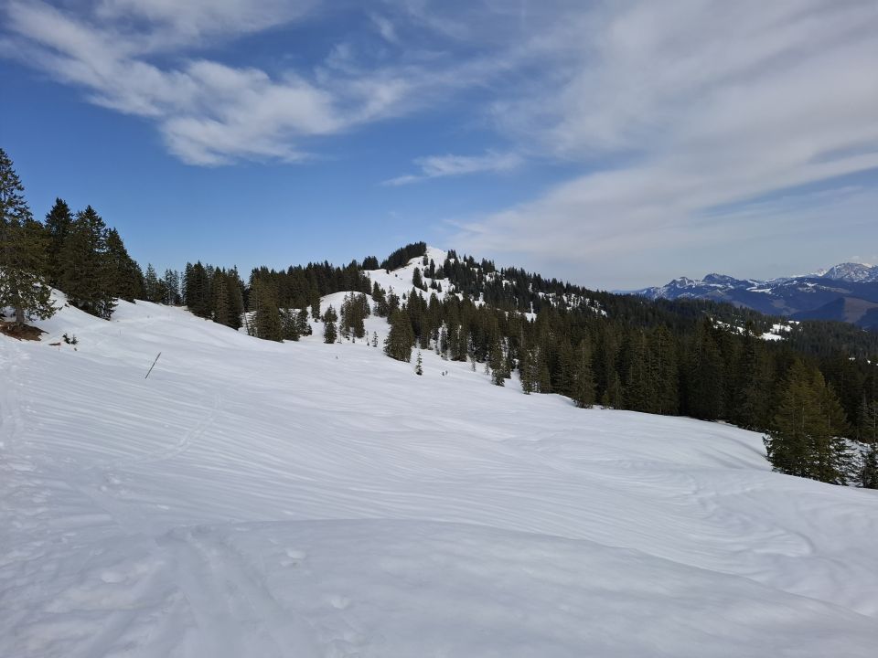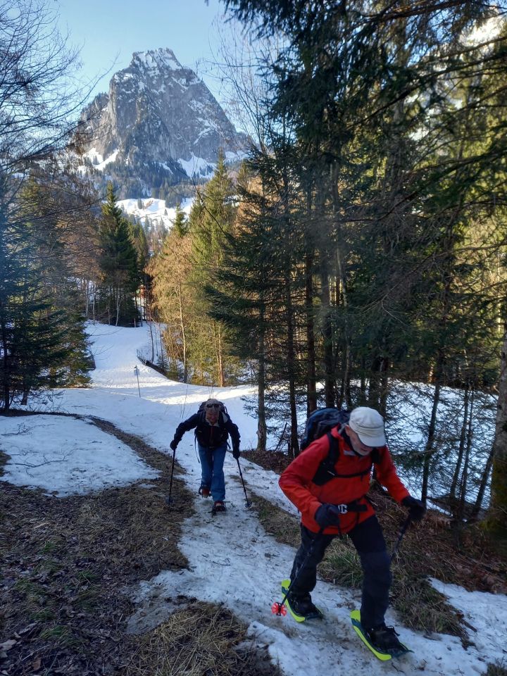 ganz unten wenig Schnee und im Wald manchmal apere Stellen. An den schattigen Stellen war der Schnee morgens noch hart, an den sonnigen Stellen weich. Alles in allem gut zu gehen.