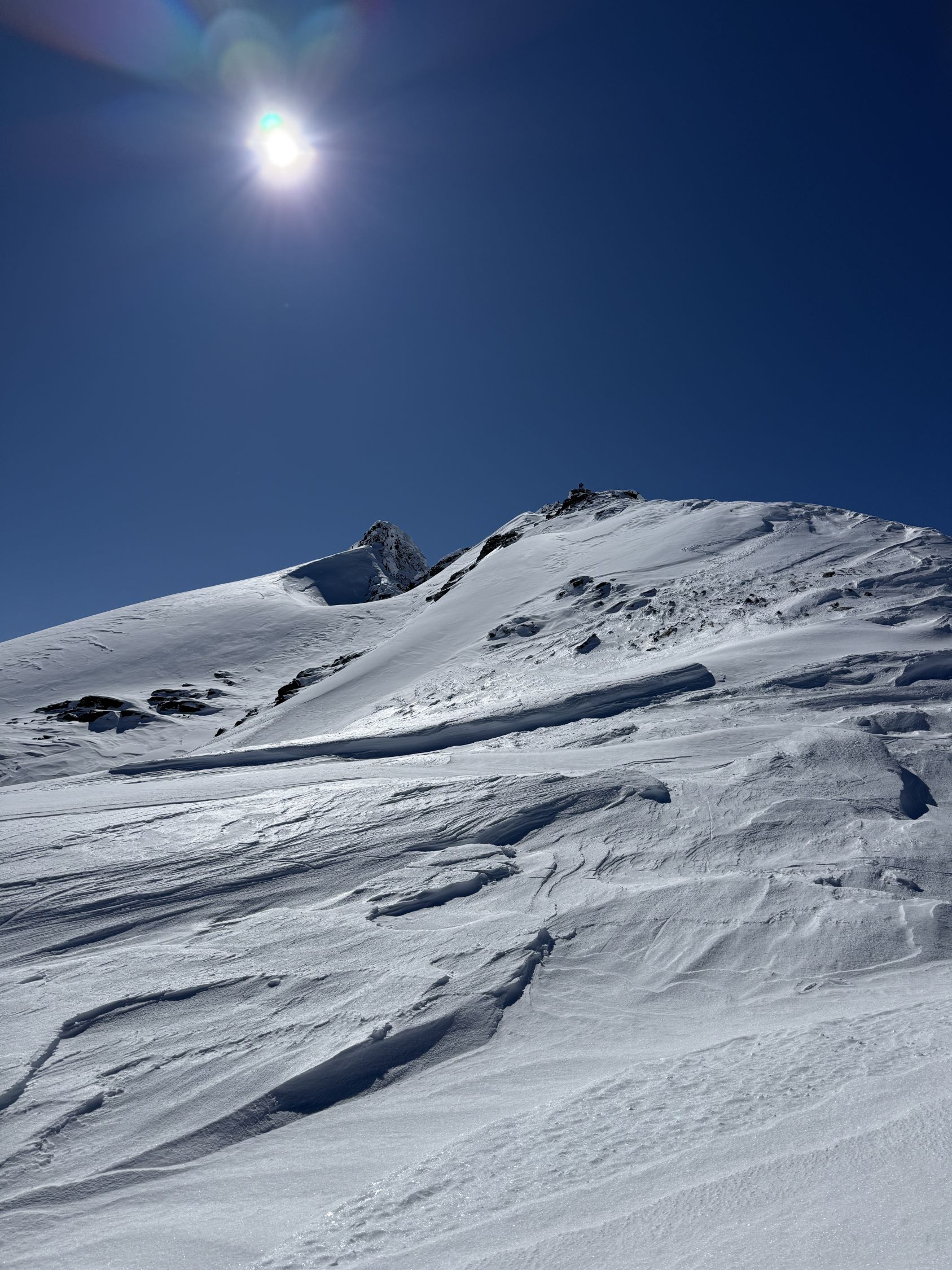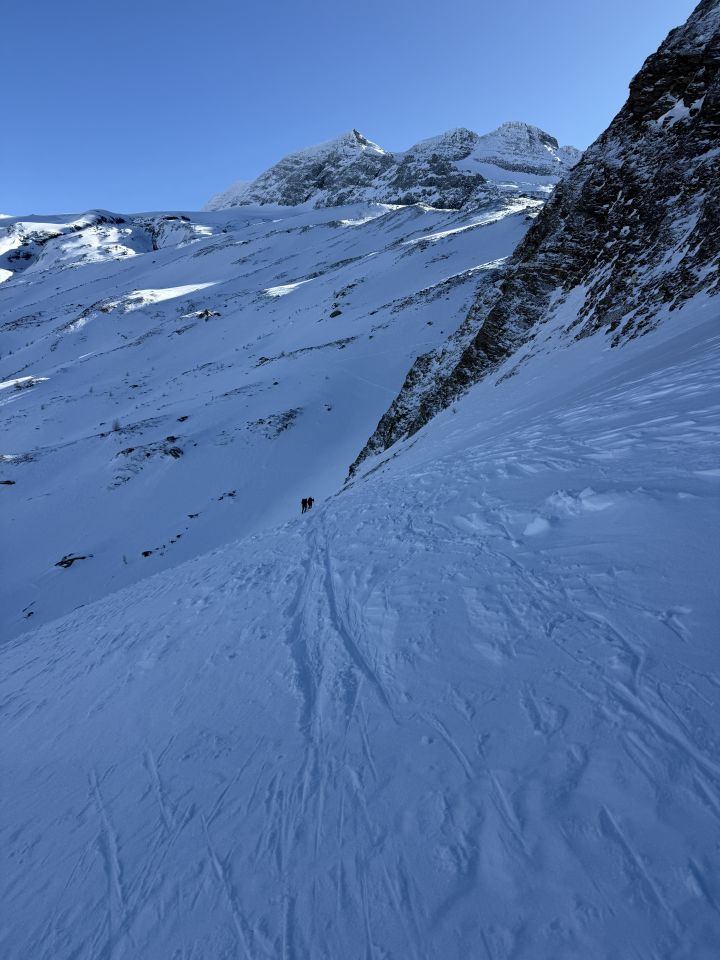 Schöne Tour, alles gut machbar bei griffigem Schnee. Wir wollten eh nur bis zum Breithornpass aufsteigen. Abfahrt im oberen Teil leichte Pulverschicht, weiter unten eher hart griffig, aber sehr gut fahrbar.