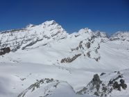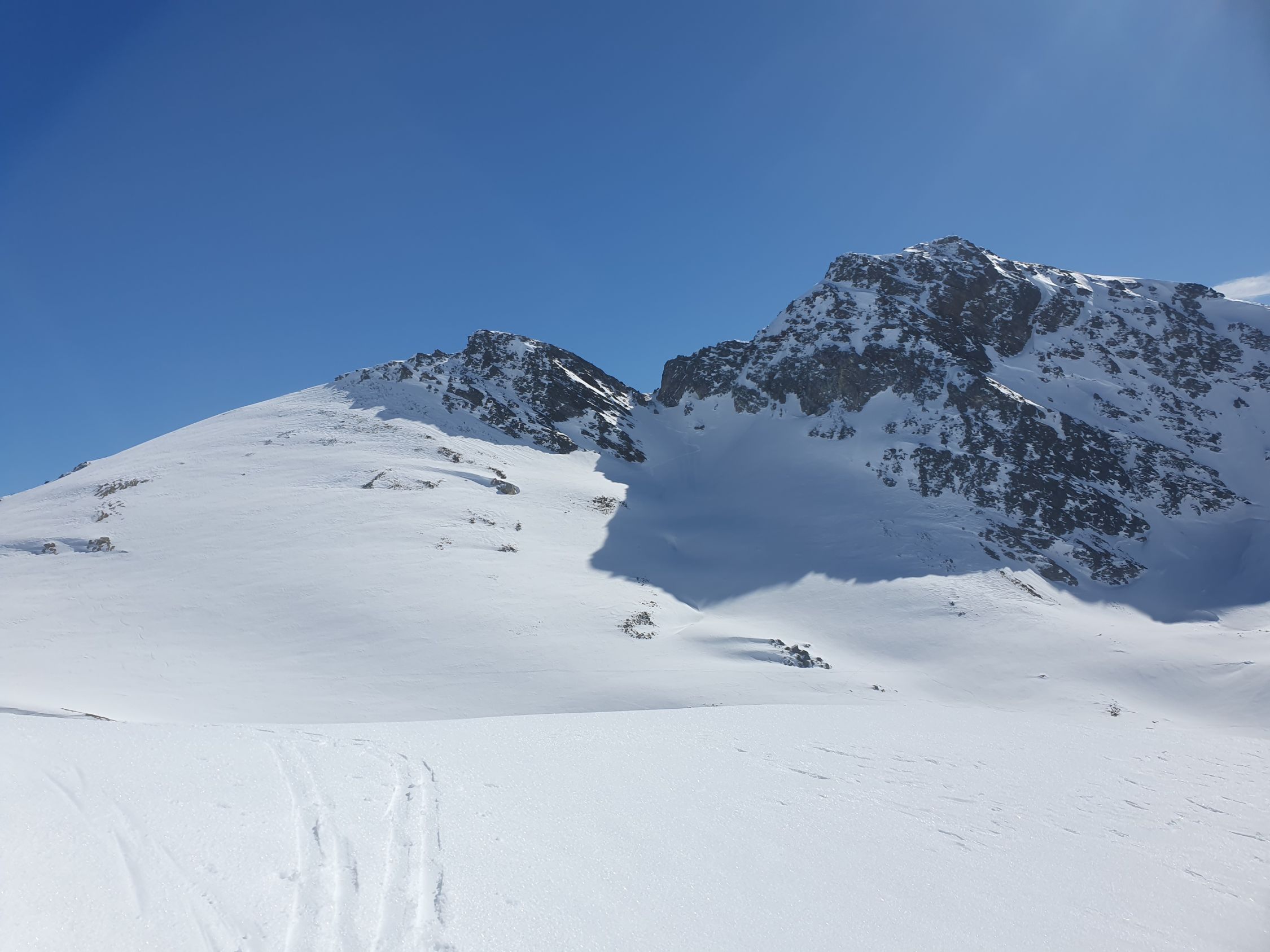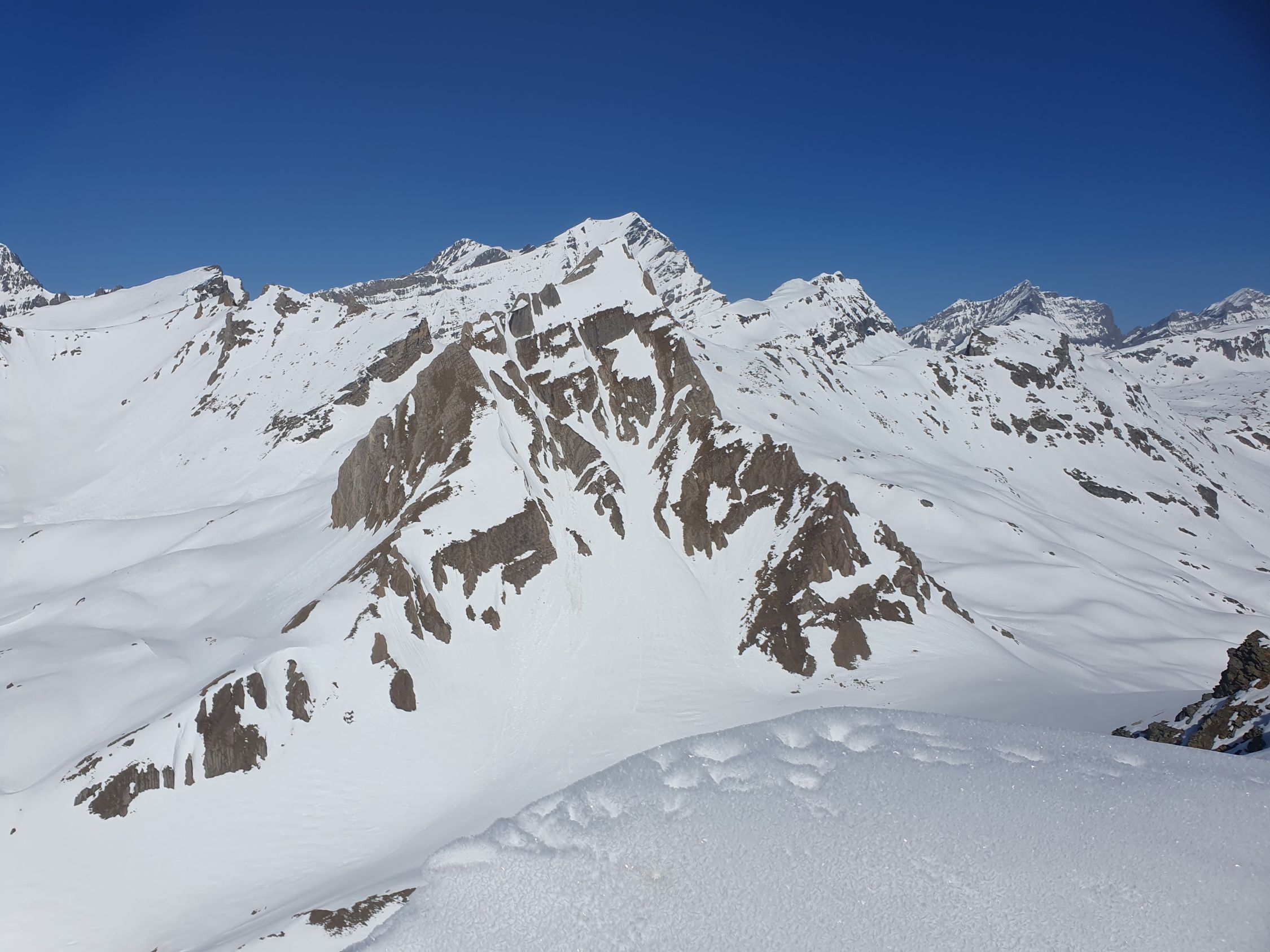 Nach dem Anfellen wähle ich einen sehr steilen Ausstieg zur ersten Mulde (hier lieber die sicherere Skitourenroute wählen). Danach in angenehmer Steilheit via P2866 einfach zum Mauerhorn. Viele Spuren direkt vom Mauerhorn nach SSE gesehen.