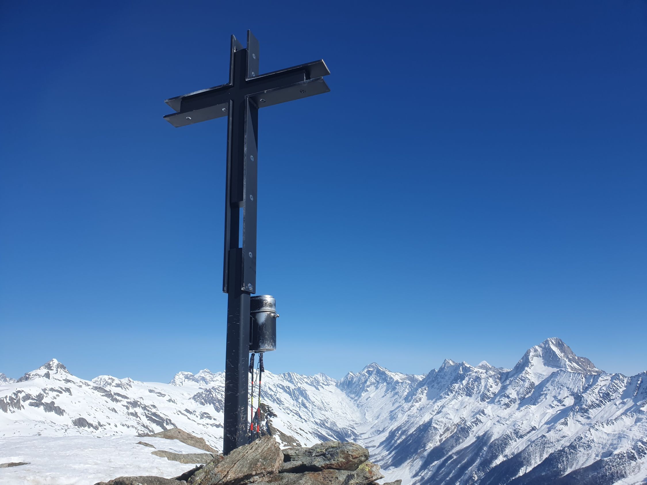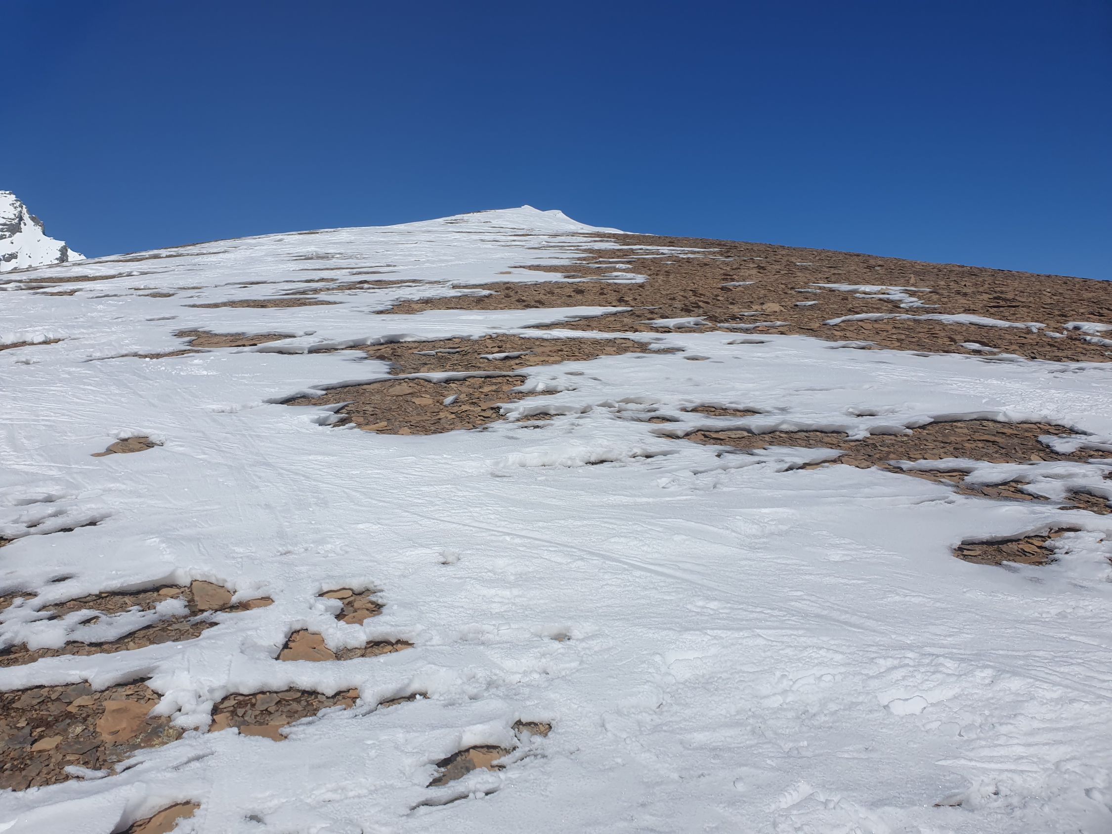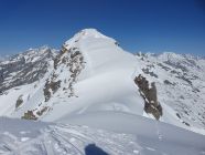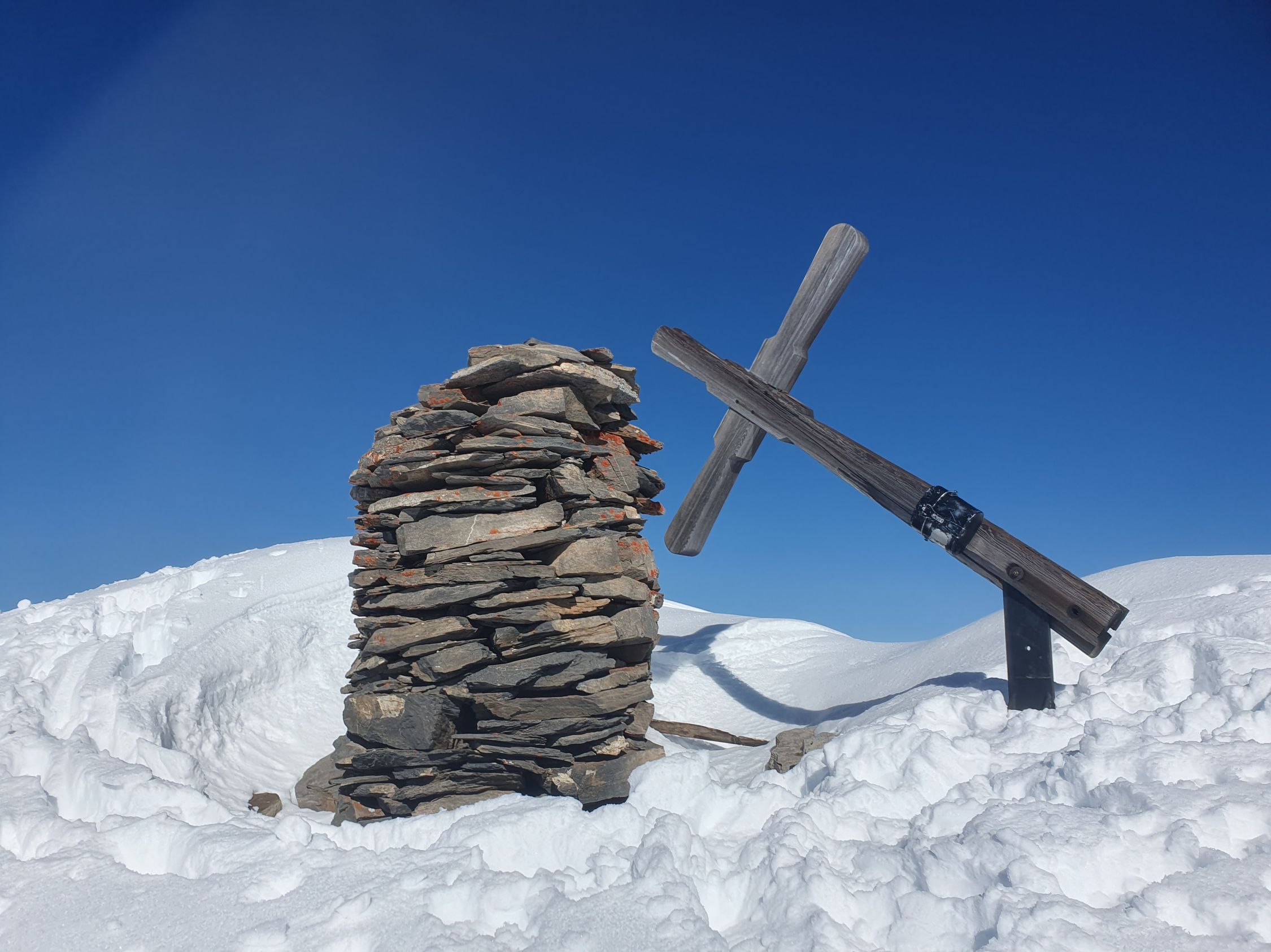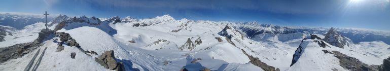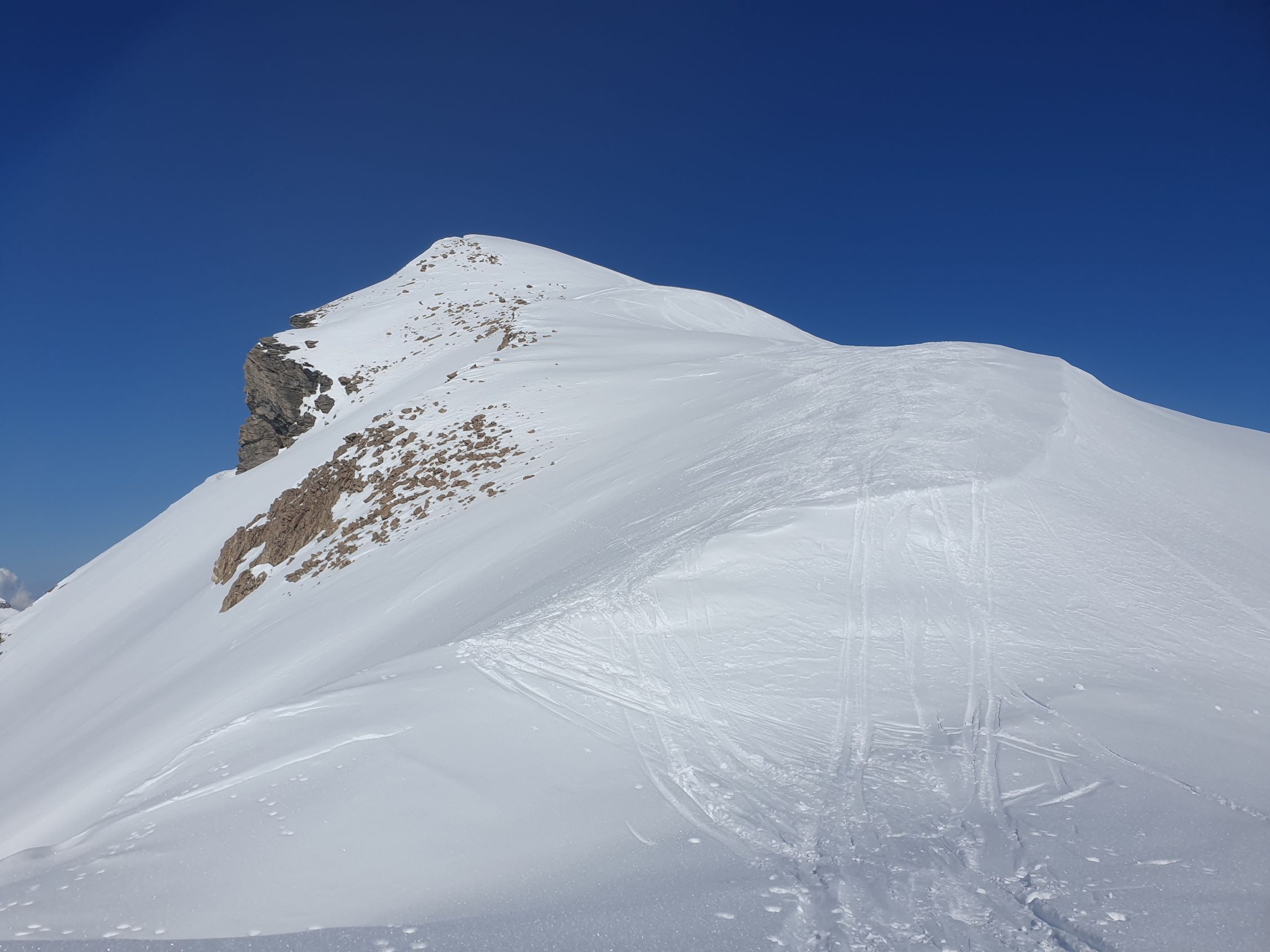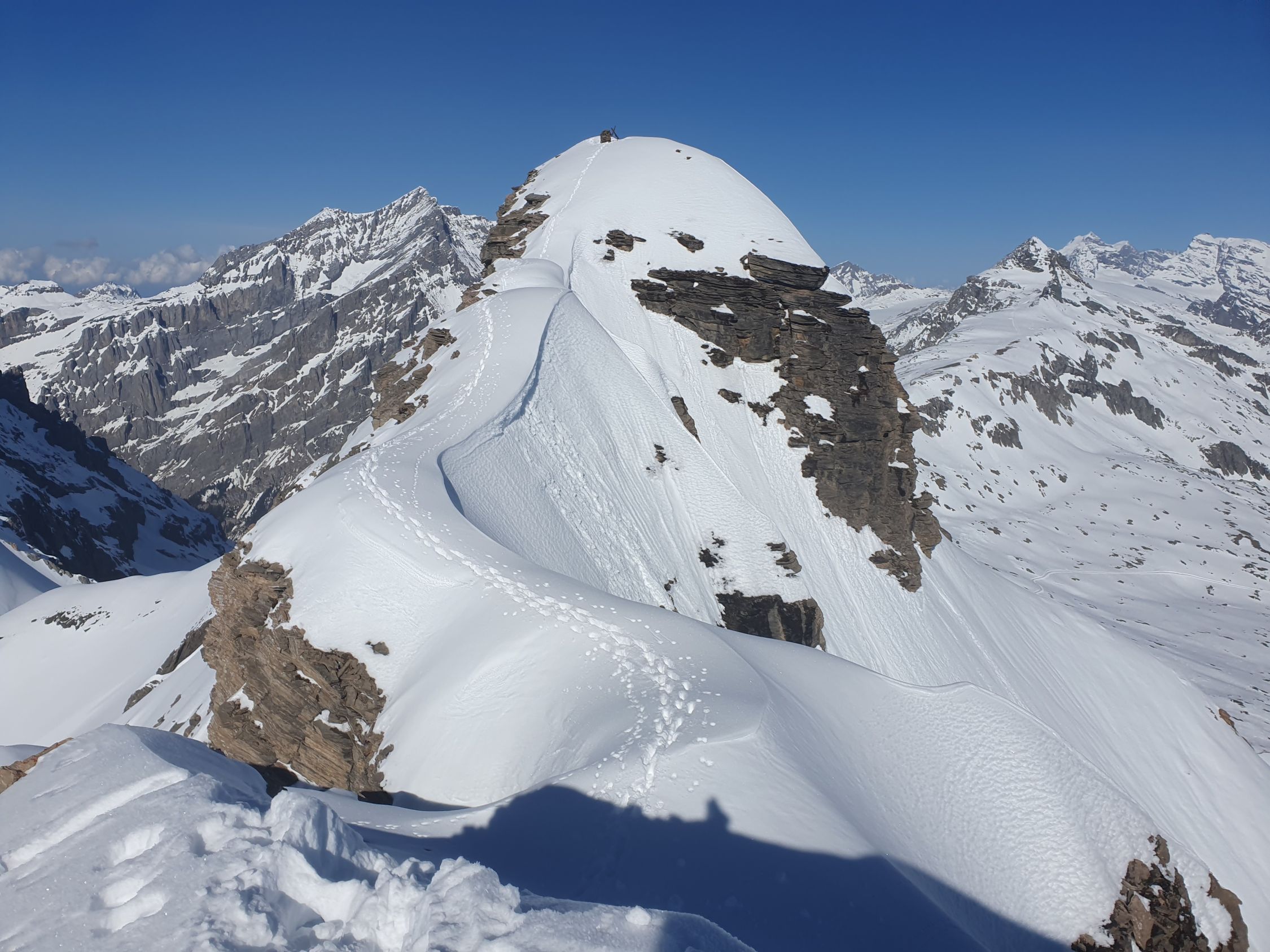 Abfahrt auf dem SW-Grat nach P2866 und auf etwas Pulver den Oberfeldengletscher hinab zum kleinen Seelein bei P2743. Nun felle ich an und erreiche einfach den Ferdenpass. Der sehr lange SW-Grat vom Ferdenrothorn scheint kein Ende zu nehmen. Unten ist er stark verblasen, doch mit Ski ist er noch immer gut zu meistern. Ich steige mit Ski bis kurz nach dem Wintergipfel bei P3175 und mache erst da Skidepot. Kurz vorher haben zwei Einheimische den Schlussaufstieg gespurt, danke nochmals dafür! Im meist losem Pulver verfolge ich die Spuren auf und ab den hügligen Grat bis zum Hauptgipfel mit dem grossen Steinmann und den schrägen Gipfelkreuz.