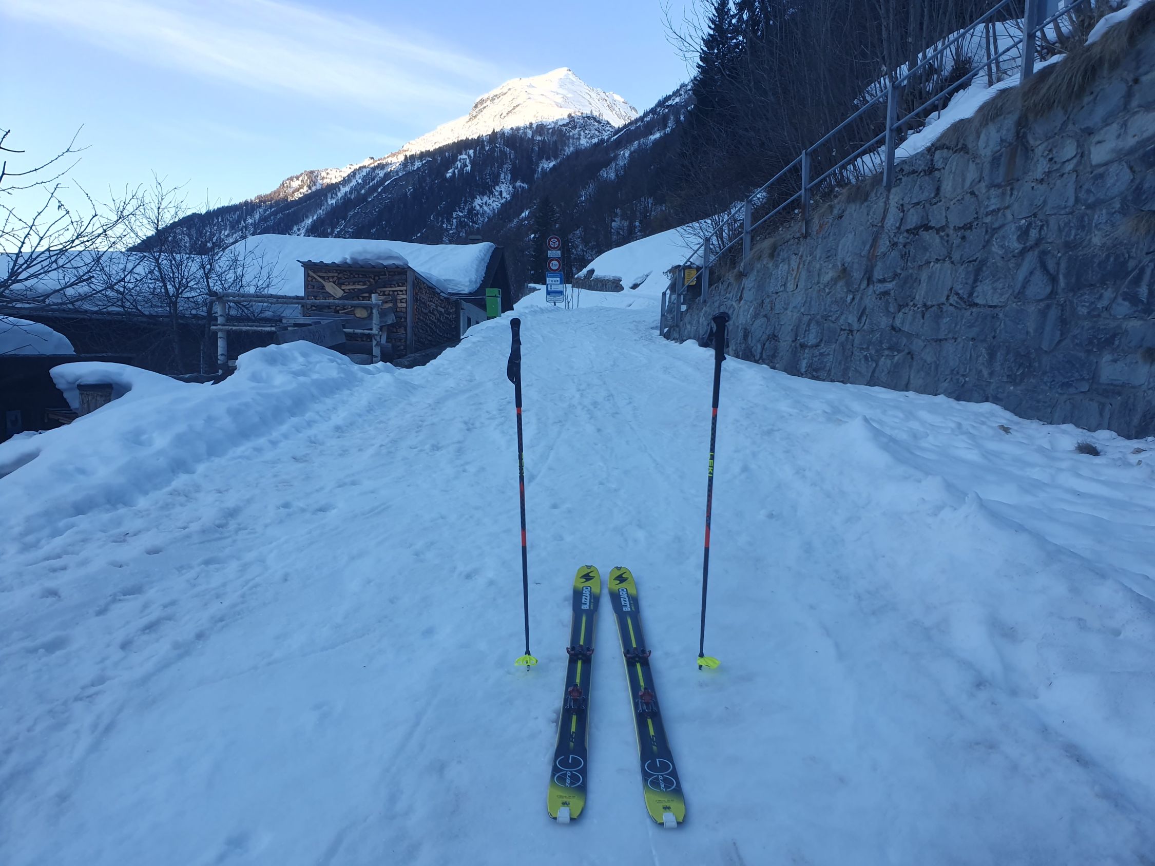 Ich starte um 08:15 bei Ferden Dorf. Nach der ersten Kurve kann ich die Ski schon anschnallen und auf einer durchgehenden Schneedecke hochsteigen.
