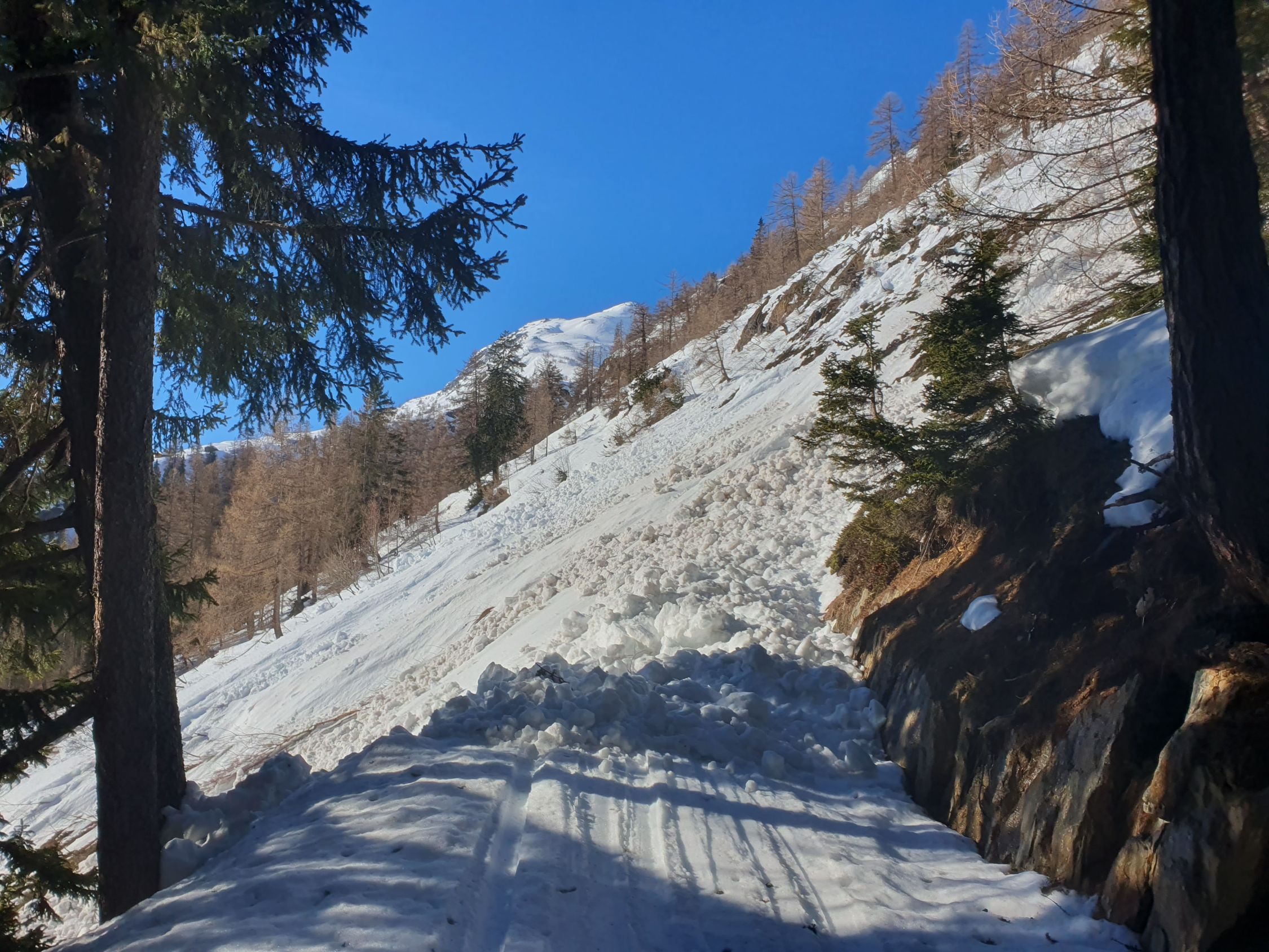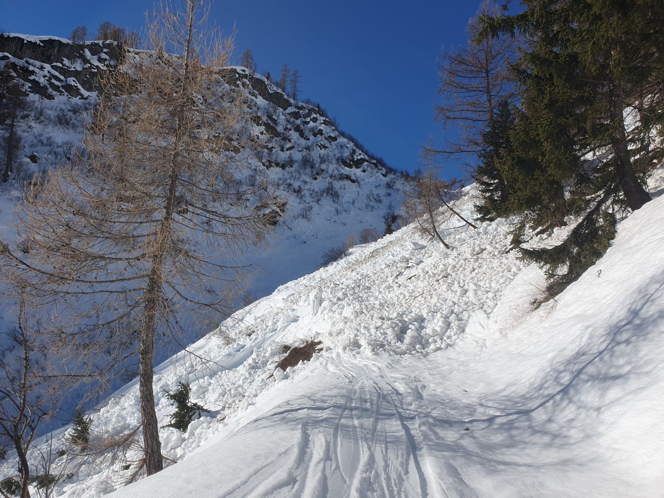 Kurz etwas vorsichtig zurück zum Skidepot und meist auf Hartschnee hinab zum Ferdenpass. Es hat auf beiden Seiten viele Abfahrtsspuren. Zuerst im Pulver westlich hinab unter den imposanten Felsen. Bald schon treffe ich leider Bruchhasch, der erst weiter unten in der Sonne Platz für Sulz machte. Ab P1933 wird es im Wald bis zum Majingsee etwas abenteuerlich. Danach auf gemachter Piste einfach hinab nach Leukerbad.