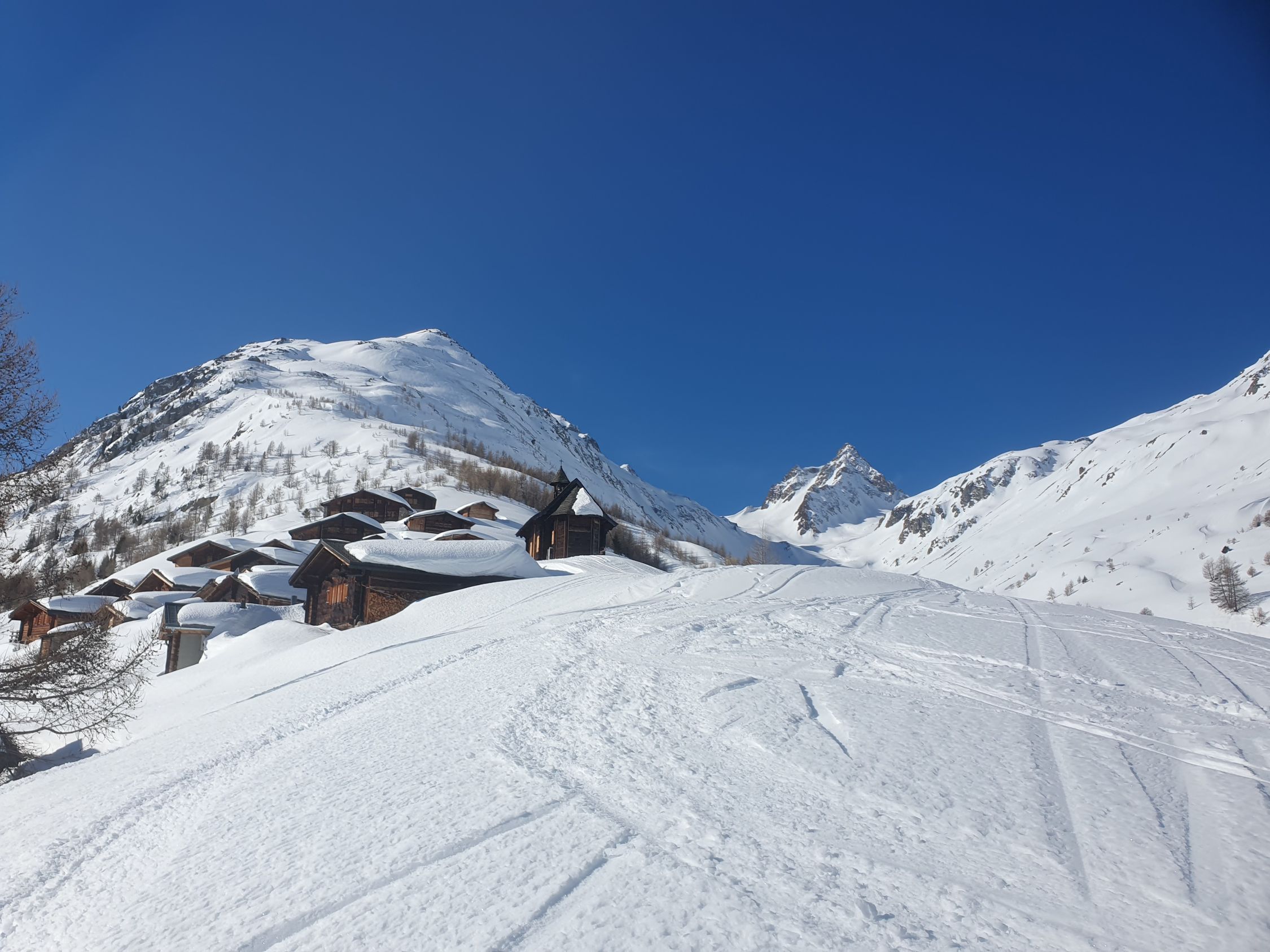 Viele junge Rutscheinheiten überquere ich mühsam mit Ski bei der Traverse nach Alpignu bis P1870. Danach steige ich weiter den Spuren nach zur hübschen Faldumalp, wo im Sommer sogar eine Bushaltestelle verkehrt?