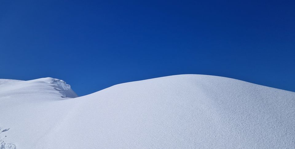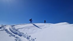 Die Abfahrt ist genial. Wir wählen die Nordabfahrt, so wie wir aufgestiegen sind. Circa 700 Tiefenmeter Pulverschnee warten auf uns. Wir finden fast unverspurte Hängen. Trotz des schönen Schnees gilt es insbesondere im oberen Teil die Steine zu beachten.