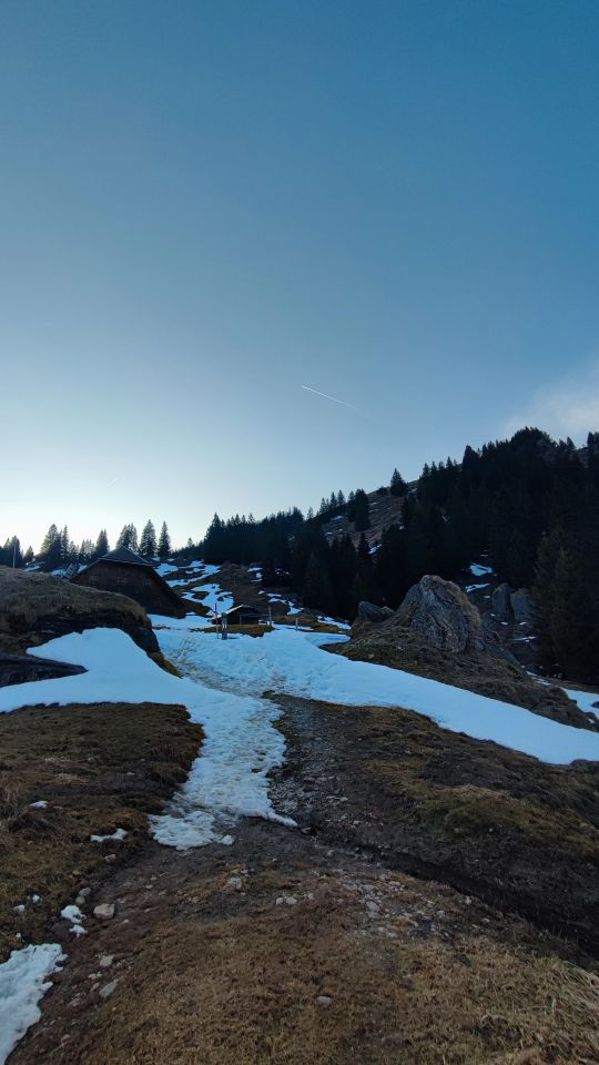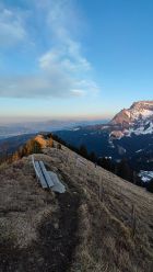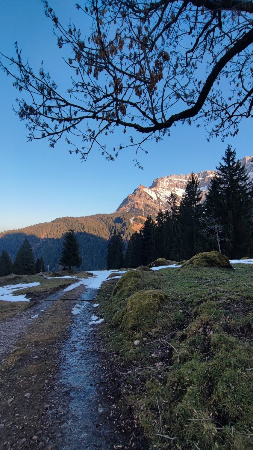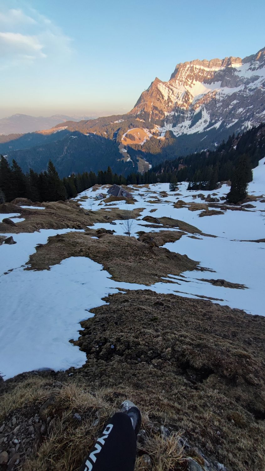 Ab unter Honegg Schnee, aber immer mal wieder schneefreie Flächen. Gipfelflanke praktisch aper. Grödel frühmorgens kônnen helfen, heute Abend nicht nötig.