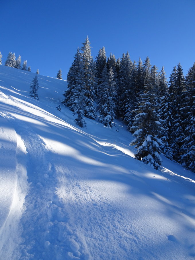 In den steileren Abschnitten braucht es noch mehr Schnee. Sonst schöner Pulver