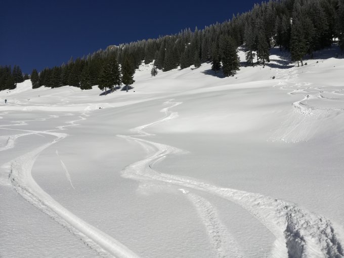 Großteils Pulver, in den steilen und sonnigen Bereichen ist schon ein Deckel drauf. Teilweise minimaler Bodenkontakt. Sipplinger Nord und Heidenkopf NO wurden auch schon mehrfach befahren.