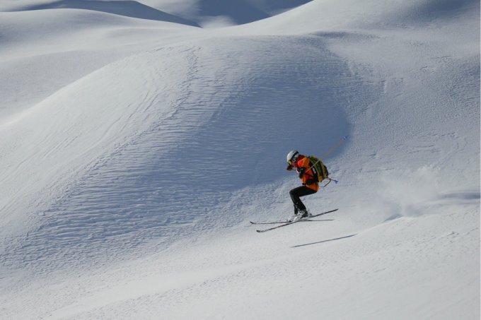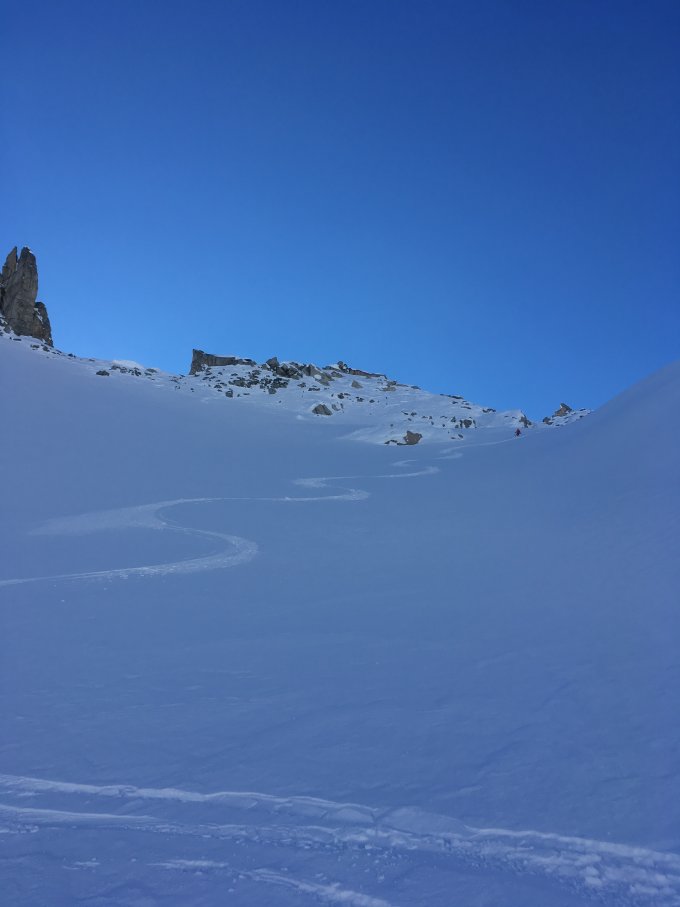 Oben ziemliche mengen Triebschnee und Hartschnee. Unterhalb 2500 Pulverschnee.