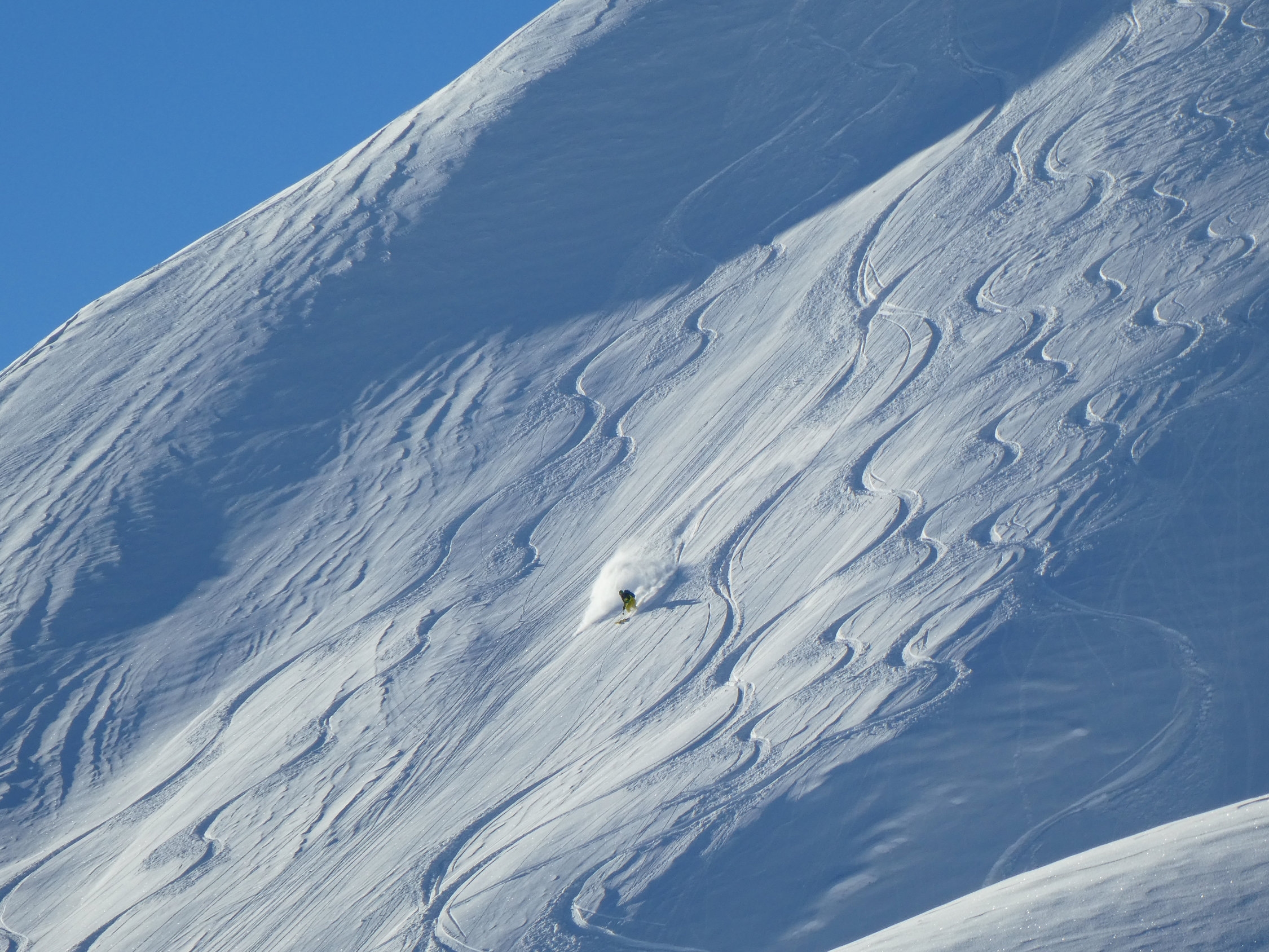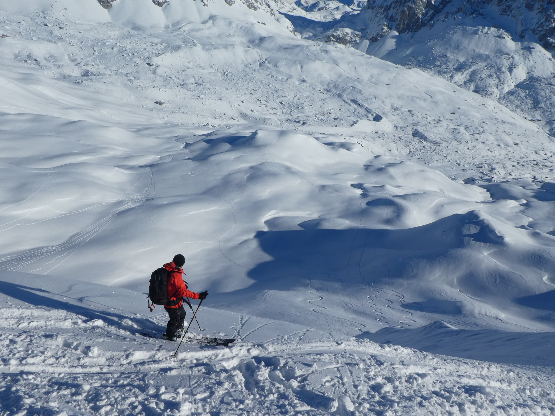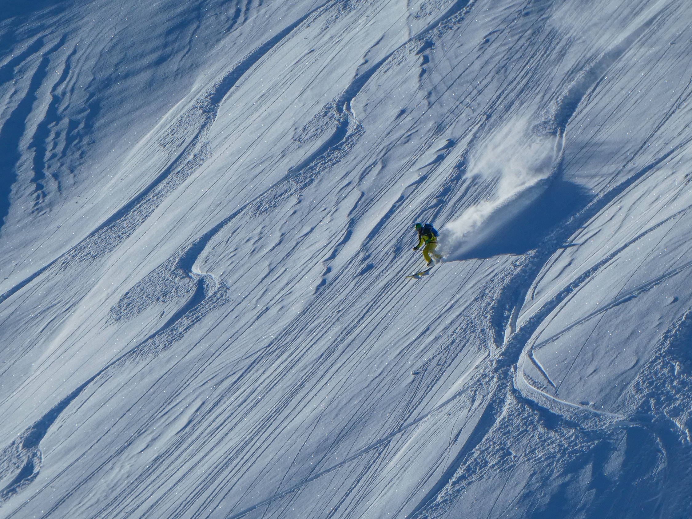 Steilhang direkt vom Gipfel abgefahren - beste Verhältnisse. Kein Steinkontakt auf der ganzen Abfahrt. Den Schafberg kann man gut anhängen (siehe Bilder).
